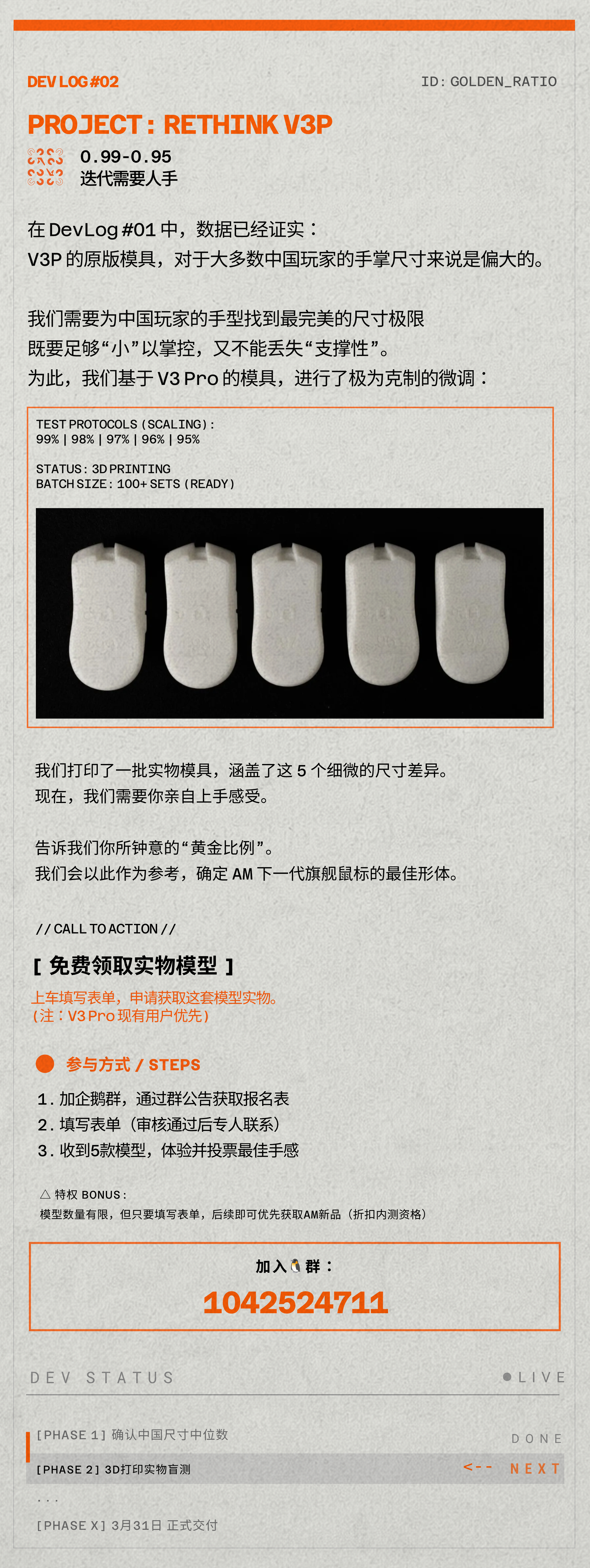 【Rethink V3P:DEV LOG 02】迭代需要人手。虽然在大规模的统计数据上中国用户的时候的确更小,但是每个人握持的方式力度等等,还是有区别。所以我们会比较大规模的基础3D打印件,请大家按按手印。这种 build in public 的模式,可能客制化圈外比较少见,欢迎支持我们的人参与。需要人手,就是字面意思。嗯没有见过的,咱们李姐万岁。预计3.31日发布,车牌号:1042524711