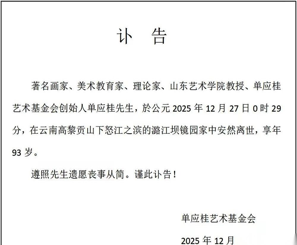 高黎贡山下,怒江边。 一个93岁的老太太,在自己取名叫“镜园”的家里,凌晨刚过,安安静静地走了。 她叫单应桂。 是个画家,山东艺术学院的教授,一辈子跟画笔、学生打交道,是个响当当的“先生”。 可我琢磨了半天,最让我心里咯噔一下的,不是她生前的名头有多大。 是她选择在哪里告别。 一个山东人,功成名就,最后没回故土,也没留在大城市,偏偏跑去了云南的极边之地。 在山脚下,江水边,给自己修了个叫“镜园”的院子,然后在那儿,为自己的人生画上句号。 这是什么? 说白了,这不是简单的养老。 这是把自己人生的最后一笔,画在了最壮阔、也最心仪的山水画卷里。 我们总在讨论,怎么才算善终。 可能这就是答案之一吧。 从生到死,每个选择都遵从本心。活得有劲,走得也体面。连谢幕的方式,都带着自己独一无二的审美。 遗愿是,丧事从简。 酷得就像她的画。 走好,先生。