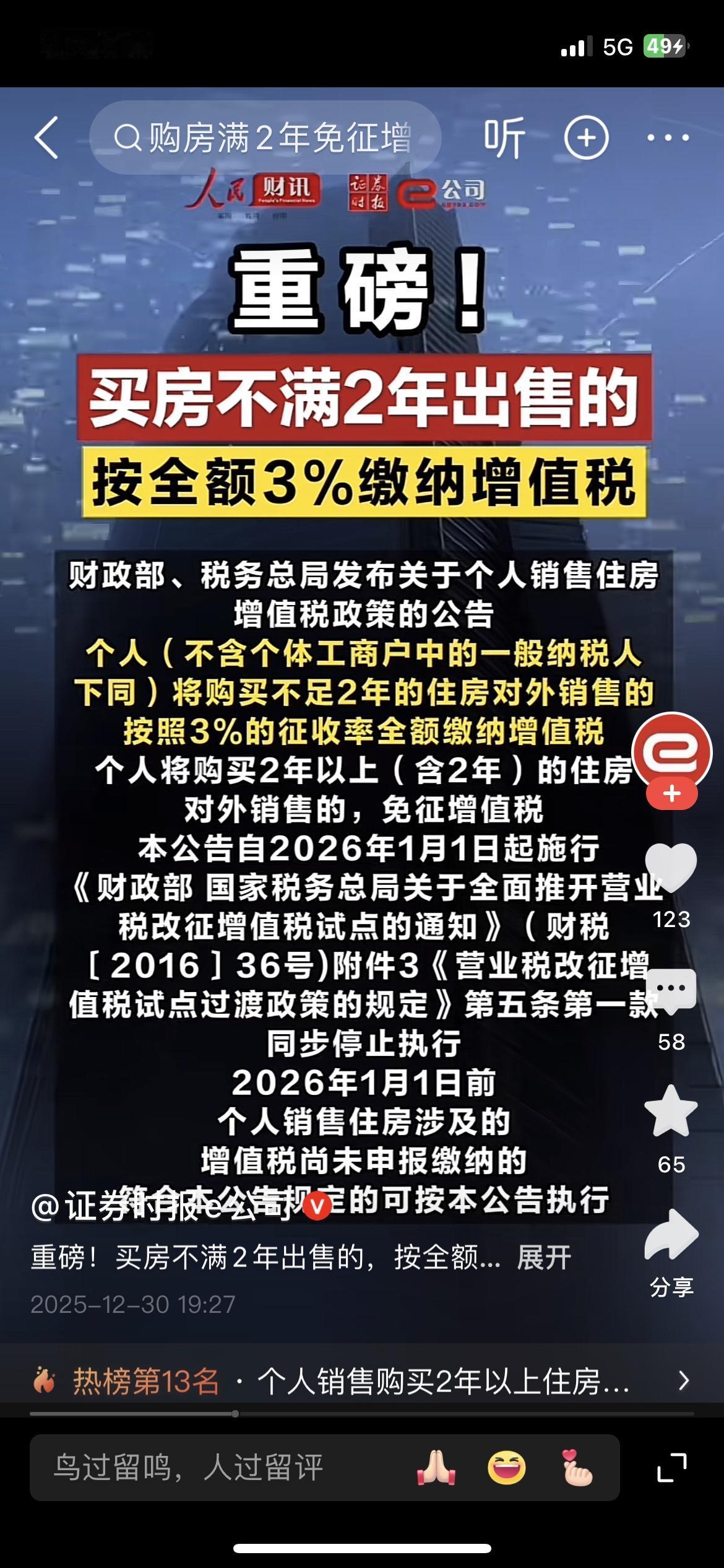 2026卖房新规落地不满2年卖房要多掏一笔钱民生房产 表姐昨天兴冲冲跟我说,想把婚前买的那套小户型卖掉换个大的,结果刷到刚出的卖房增值税新规,当场就拍腿喊“这税也太高了,不卖了不卖了”! 我凑过去一看才知道,2026年1月1日起,个人卖房子有了新规矩:要是房子买了还不满2年就对外卖,得按房子全额的3%缴增值税;但如果满2年(包括2年)再卖,增值税直接免了。而且哪怕是2026年1月1日前没申报缴纳的卖房增值税,也得按这个新规来。 表姐那套小户型在二线城市,市价大概110万,按3%的税率算,光增值税就要交3.3万。她本来想着卖了房凑首付换学区房,这下多出来的三万多,够孩子小半年的早教费了,思来想去真就决定先把房子租出去,等满2年再卖,能省不少钱。 其实身边不少朋友都有置换房产的想法,尤其是刚买房一两年就想换的,看完这个新规都直呼“税太高,先不卖了”。毕竟对于普通家庭来说,几万块的税费可不是小数目,要是着急卖房,这笔钱相当于白亏了。 你身边有没有打算近期卖房的亲戚朋友?他们是不是也觉得税太高不想卖了?觉得这个政策会让二手房市场的挂牌量变少吗?房地产新规 买房增值税