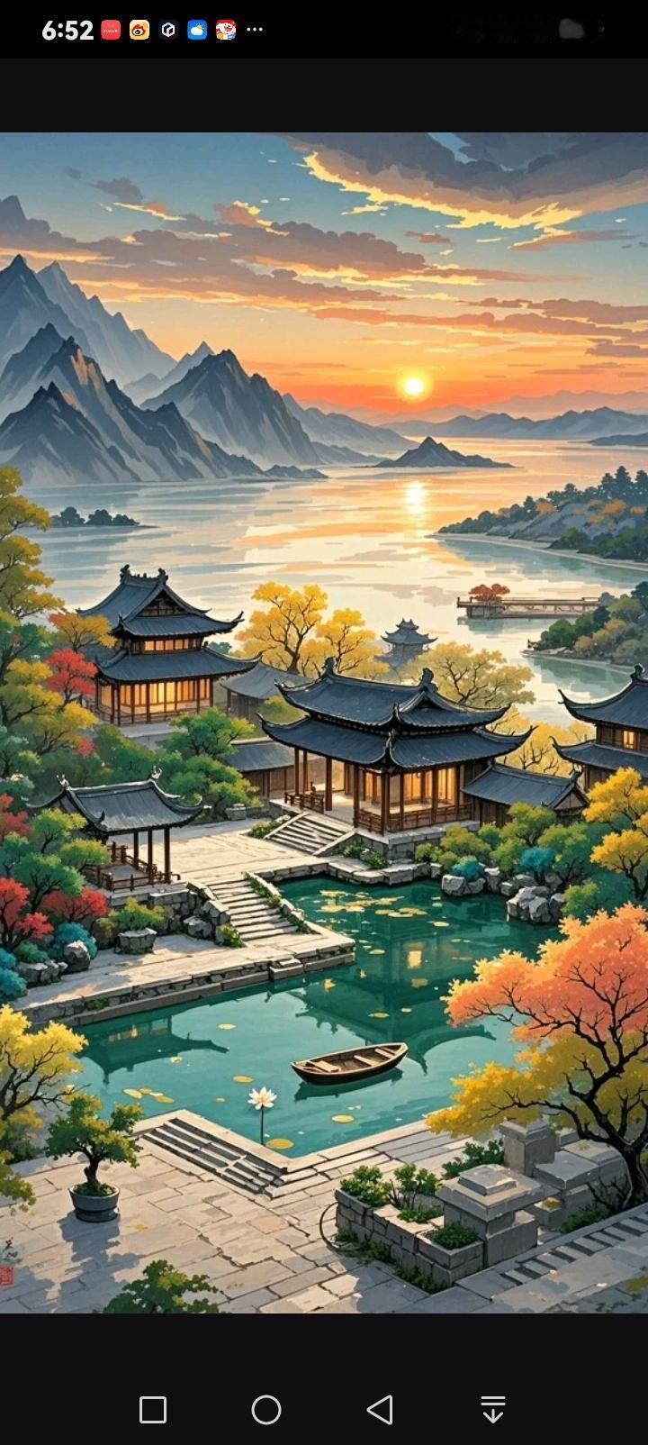 落日熔金,洒在粼粼的湖面上,将远山晕染出温柔的轮廓。古雅的亭台错落于池畔,飞檐翘角映着晚照,阶前碧水漾着荷影,一叶小舟轻泊其间。秋树斑斓,红枫黄杨簇拥着黛瓦朱窗,晚风掠过,似能听见亭中灯影里的轻声闲谈,一方山水,藏尽了江南的温婉与诗意。