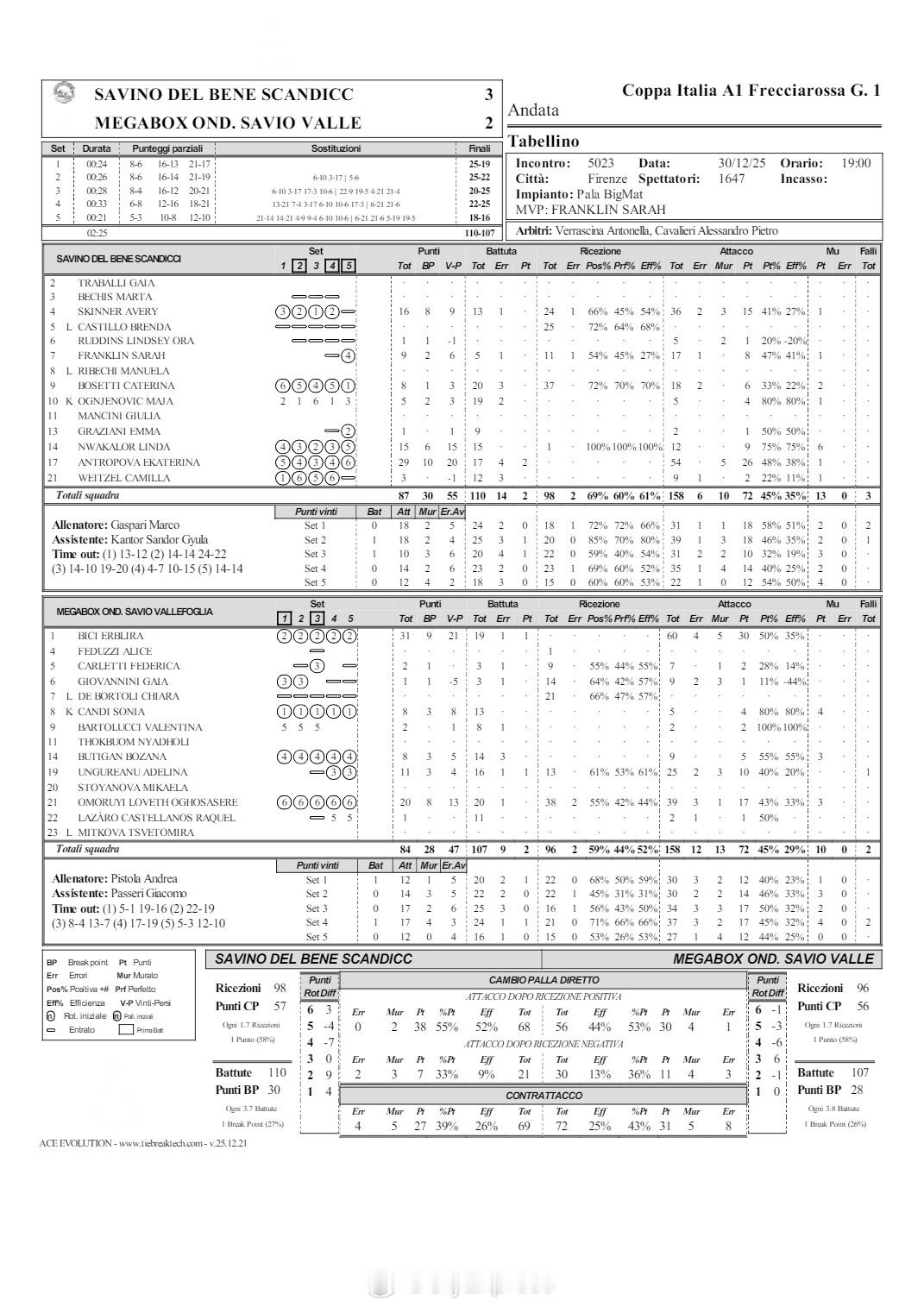 【女排意大利杯斯坎迪奇险翻船 3-2险胜瓦莱福里亚进四强】国际排坛战报速递 12月30日佛罗伦萨,女排意大利杯1/4决赛,斯坎迪奇主场在先赢两局的情况下被连扳两局,决胜局战至加分才以3-2(25-19/25-22/20-25/22-25/18-16)险胜瓦莱福里亚,晋级四强,半决赛将对阵基耶里。安特罗波娃29分、斯金纳16分、恩瓦卡勒15分、后两局才上场的富兰克林9分荣膺MVP,比希31分、奥莫鲁伊20分、乌恩古里亚努11分。