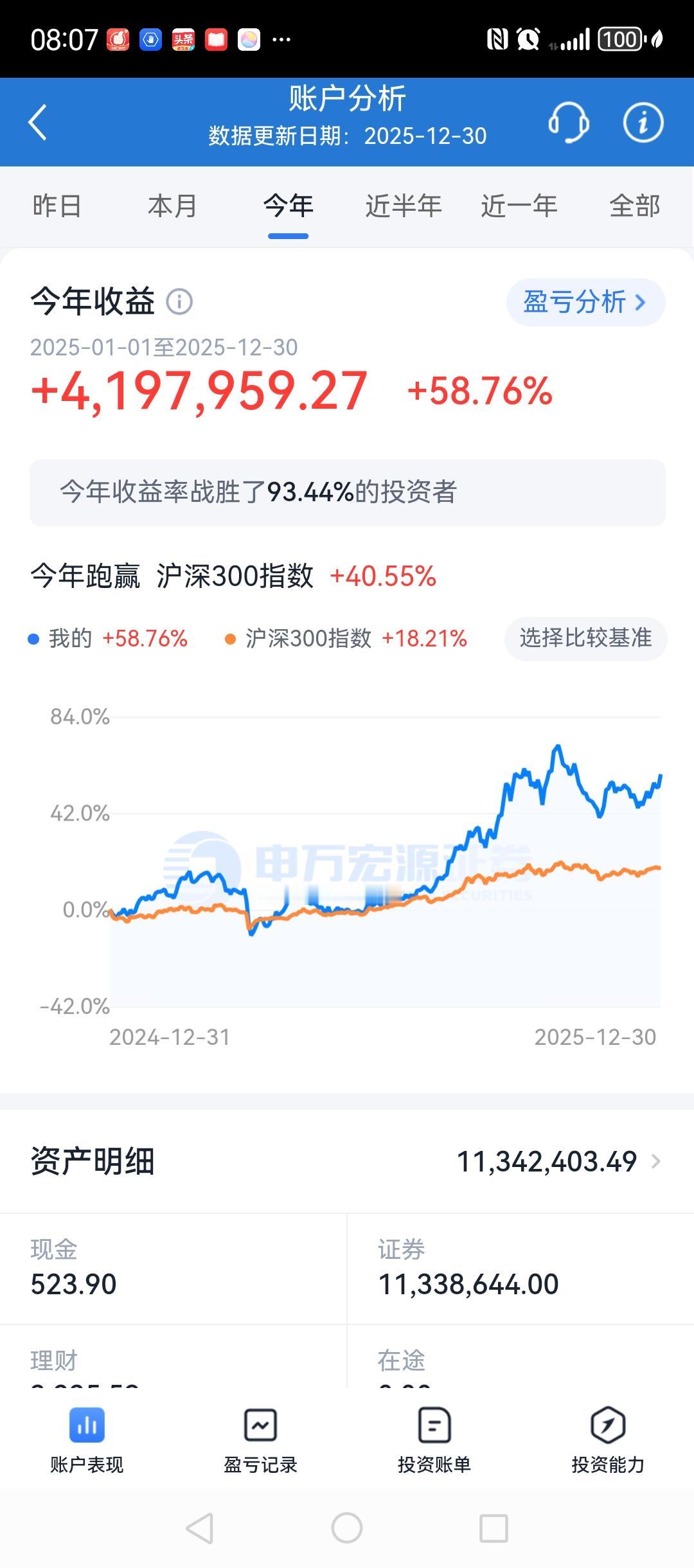 新年的钟声即将敲响,账户今年的收益基本锁定在60%。 去年的收益是将近150%,今年是60%。复利起来还是非常可观的。两年赚了800多万。 目前持股非常不错,为2026年打下不错的基础。手中这些股票还要继续涨,值得期待!