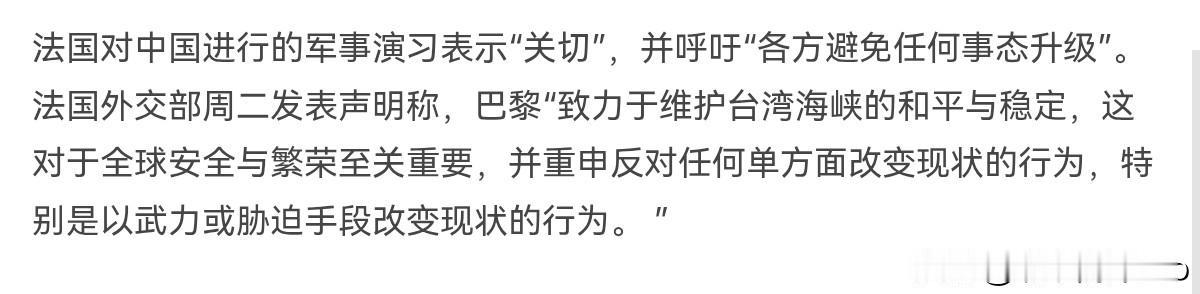 法国出来表态了!在我们举行军演之际,12月31日,法国外交部发表声明声称,巴黎致力于维护台湾海峡的和平与稳定,这对于全球安全与繁荣至关重要,并重申反对任何单方面改变现状的行为,特别是以武力或胁迫手段改变现状的行为。 很显然,从法国的表态来看,法国显然把我们的军演定义为了武力胁迫。 那我们倒是想问,美国对台军售,对我们是不是武力胁迫,高市早苗的台湾有事论,是不是以武力对我们的警告?但是法国有站出来坚决反对美国对台军售,反对高市早苗的挑衅言论吗?法国声称反对任何单方面改变现状的行为,中国人解决自家事,关法国何事? 法国的意思是中国不应该统一,反对中国统一吗?对于我们的内政问题,没有法国指指点点的空间,法国真希望和平,就应该严格遵守一个中国原则,支持中国和平统一。任何域外势力想要插手我们的内政,绝对没有好下场,法国应该谨言慎行。台湾问题上,没有法国可以操作和表演的空间。