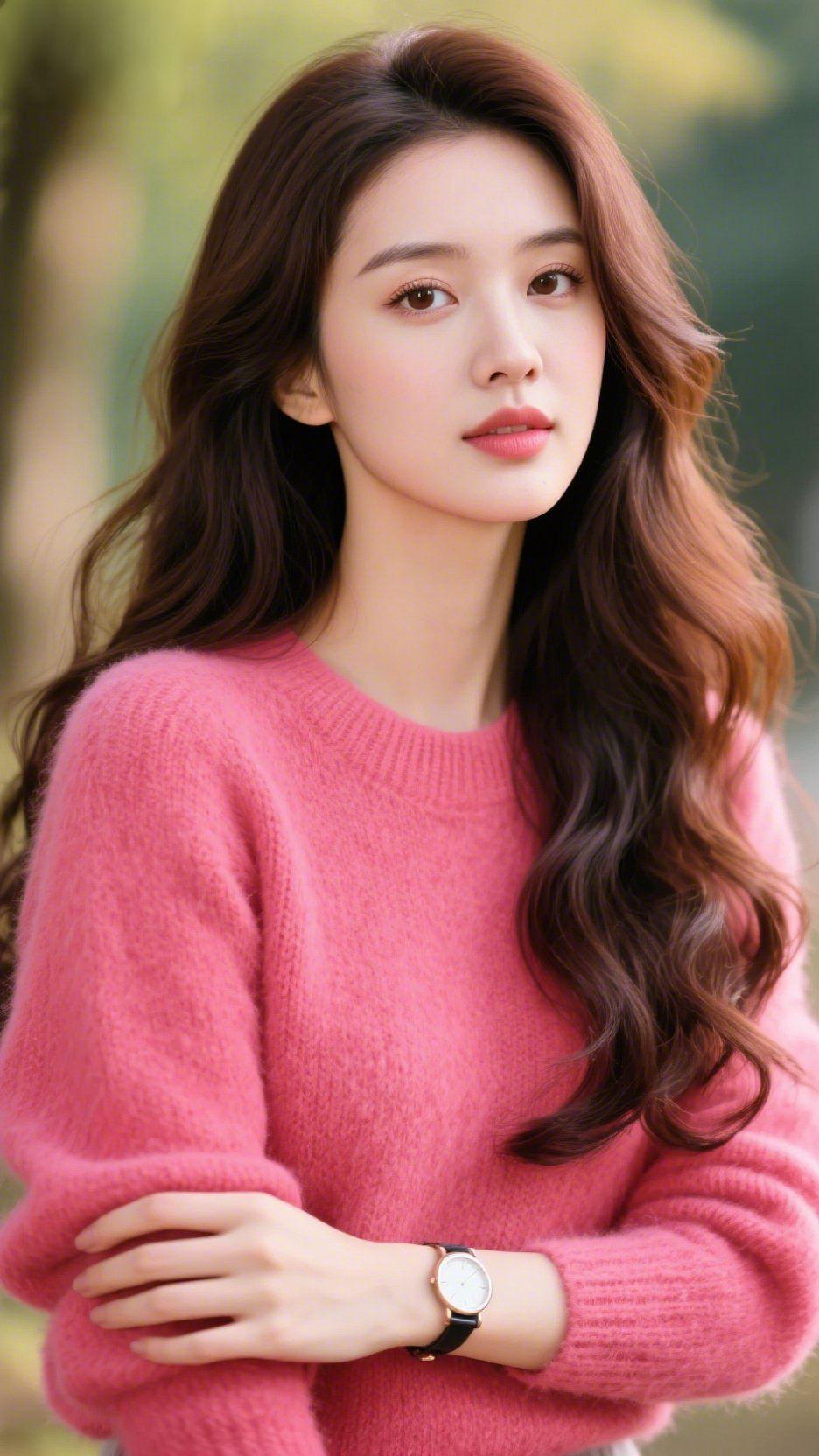 《粉衫携风,眸底含春》 春日的风裹着软意,落在她肩头那件粉毛衣上——绒线织就的暖,像把天边的绯云揉作了衣,松松软软裹着舒展的温柔。 长发是晕开的焦糖色,卷梢随微风轻晃,发尾扫过衣领时,连空气都浸了点轻软。她抬眼时,眸光像晨雾里的湖,清透得能盛下整片春林,唇色是浅粉的桃,轻轻抿着,像藏了半缕春的气息在唇角。 腕间的表针轻转,黑色表带裹着银白的盘,是柔意里藏的一点清冽,像春日里掠过的微凉,让这软和的甜,多了几分恰好的舒展。 原来春日的好看,从不是花团锦簇的喧闹,是这样浅浅的、松松的,像风裹着暖意,落在心上时,连呼吸都轻缓了。 春日柔意 日常轻暖