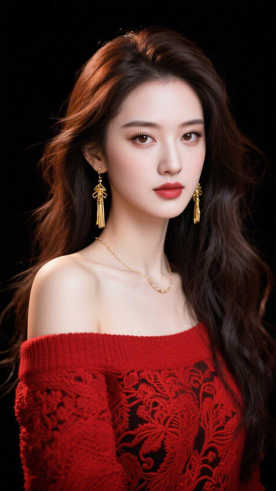 《红绒含雅,金饰藏温》 黑底衬着这抹红绒,像把暖焰织进了针脚里——露肩的弧度舒展得恰好,蕾丝纹样裹着软,不见半分刻意的艳。 长发是浸了棕调的浪,发梢随呼吸轻晃,耳间金饰垂着细穗,颈间链光轻漾,像把星子的暖凝在衣畔,亮得柔而克制。她抬眼时,眸光像落了光的潭,清透里裹着静,唇色是匀开的红,轻轻抿着,似藏了半分舒展在唇角。 无需繁缀,这一身红绒配着金饰,便把“柔而有韵”写得明明白白——是暖里裹着的雅,是舒展中藏着的稳,像暗夜里落了束柔光,落在心上时,连呼吸都轻暖了几分。原来热烈从不是灼目的艳,是这样妥帖的、轻软的,如绒光裹着温。 红绒柔韵 金饰雅感