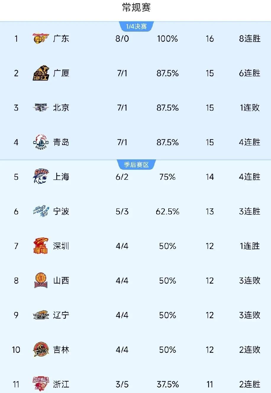 广东一骑绝尘!CBA最新排名情况! 广东男篮在昨日大比分战胜天津后,目前赛季至今未尝败绩8胜0负,也是目前CBA唯一一支不败的球队,难道广东男篮王朝又来了? 第一名,广东男篮8胜0负 第二名,广厦男篮7胜1负 第三名,北京男篮7胜1负 第四名,青岛男篮7胜1负 青岛男篮属实没想到,本以为在杨瀚森走之后会堕落,没想到成绩居然这么好,刘维伟还是有两把刷子的!