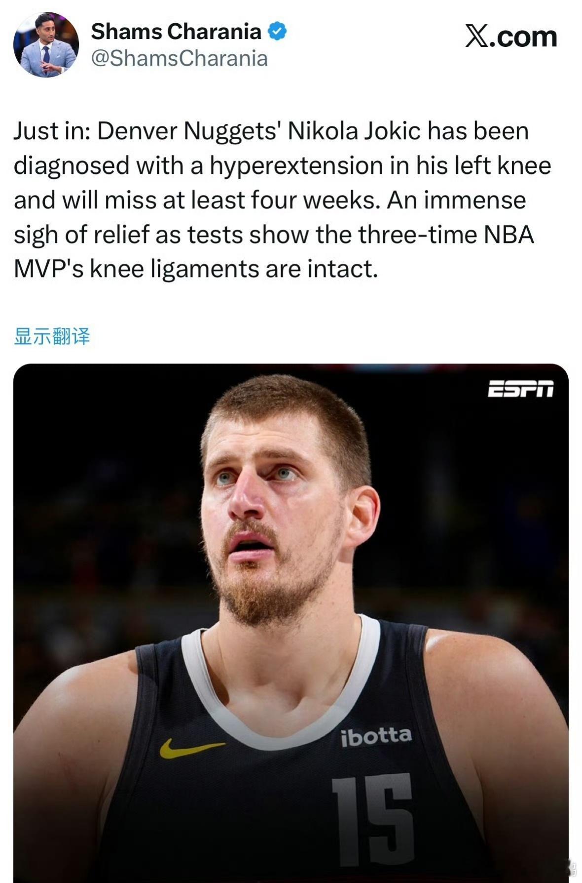 好消息!约老师膝盖并无大碍!坏消息!亚历山大成最大赢家!根据shams最新消息,掘金核心中锋、三届MVP得主约基奇的伤情诊断结果已经公布。在昨天对阵热火的比赛中,他不慎被队友琼斯踩到脚部,导致左膝过度伸展,预计将缺席至少四周。不过值得庆幸的是,他的膝盖韧带并未受损,这可谓不幸中的好消息了,老天保佑了!而如果从今天算起,约基奇将至少休战至北京时间1月28日。在这段期间,掘金共有16场比赛要打,其中包括眼下这段已经连输两场的漫长客场之旅。缺少约老师的情况下,掘金能交出怎样的战绩实在令人担忧!而尽管大瓦兰作为替补中锋,但约基奇在场与不在场时,球队每百回合净效率相差高达17.3分——简单来说,有他和没他,掘金完全是两支不同层次的球队,这一点在对阵热火的下半场已经体现得非常明显!本赛季约基奇还未缺席过一场比赛,带队打出了22胜10负的战绩,可想而知!此外,约基奇也成了掘金首发五虎中第四位伤缺的球员。而穆雷似乎脚踝也存在伤势,掘金几乎折损了1亿多美元!接下来,就需要大瓦蓝以及队内的年轻球员能不能扛起重担了!而穆雷能否在保持自身健康的同时,带队稳住战绩?这些都是掘金目前的难题。还有个坏消息——约老师如果缺席这16场比赛,他也将几乎触及本赛季评奖资格的出场数边缘。本赛季至今他原本保持全勤,但这次的伤病,很可能影响本赛季MVP争夺战,而亚历山大几乎已无限接近连续第二年拿下MVP了!目前约老师已经连续几周霸榜MVP榜单榜首!本赛季约老师场均29.6分12.2篮板11助攻1.4抢断三项命中率达到180俱乐部!掘金目前战绩西部第三,而亚历山大本赛季场均32.2分4.8篮板6.4助攻1.5抢断三项命中率也达到180俱乐部!雷霆目前战绩西部第一!而约老师这次缺席,除了触及评选资格外,战绩也会受影响,单纯这两项,就很有可能会让约老师本来已经到手的MVP奖杯白白飞走了,真的是造化弄人啊!约基奇蝉联MVP榜首约基奇亚历山大丹佛掘金雷霆
