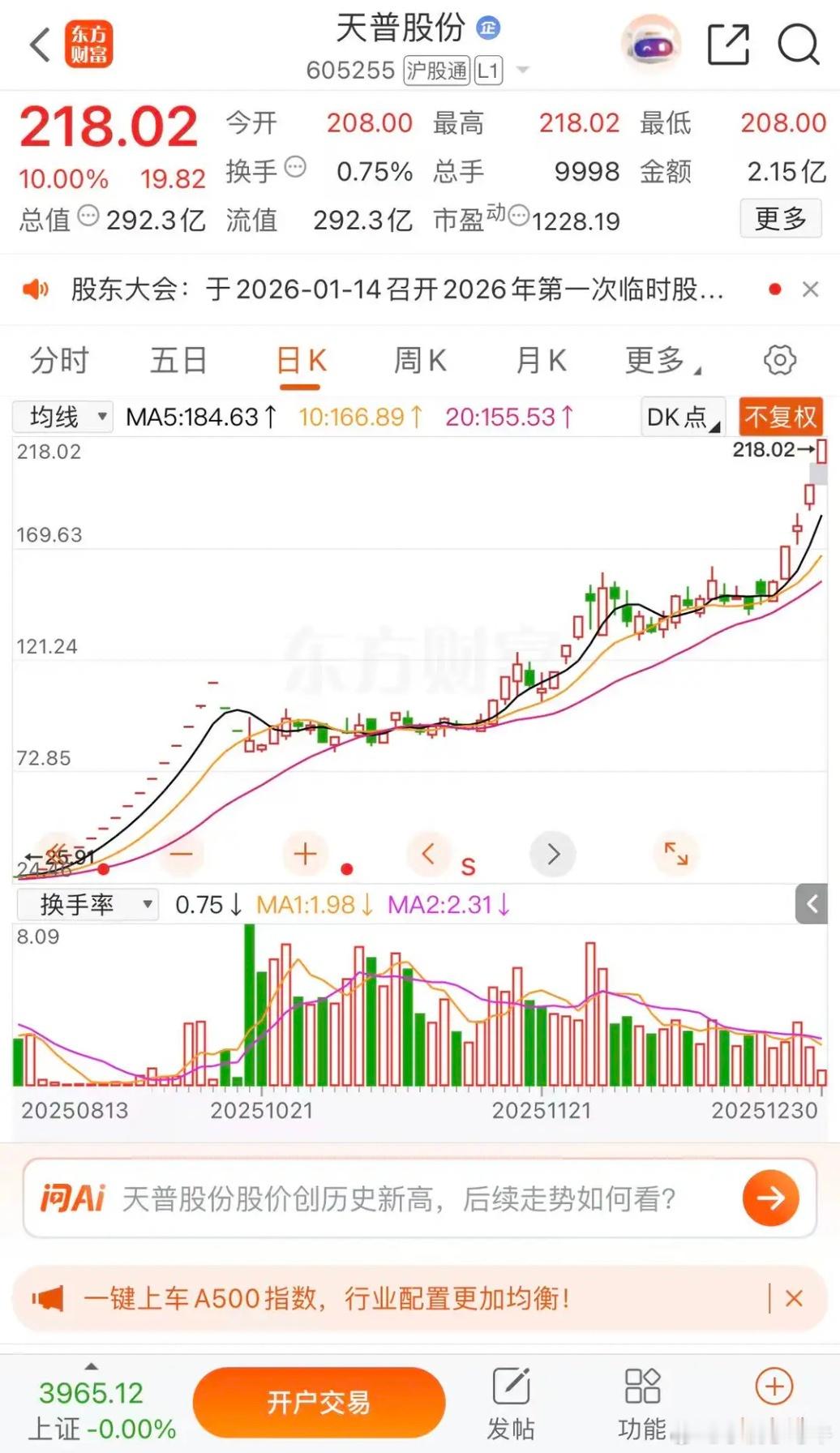天普股份停牌核查不愧是今年最牛股,山子高科明日涨停天普股份涨停板收盘报收218.02元每股,成交金额2.15亿元,全年涨幅1631.69%,16倍多蛇年最牛股。上涨以来已经至少5次停牌核查了。山子高科涨停板收盘报收4.03元每股,成交金额44.67亿元,明日涨停板4.43元每股。沪指止步10连阳,4000点只能2026再现。把握节奏