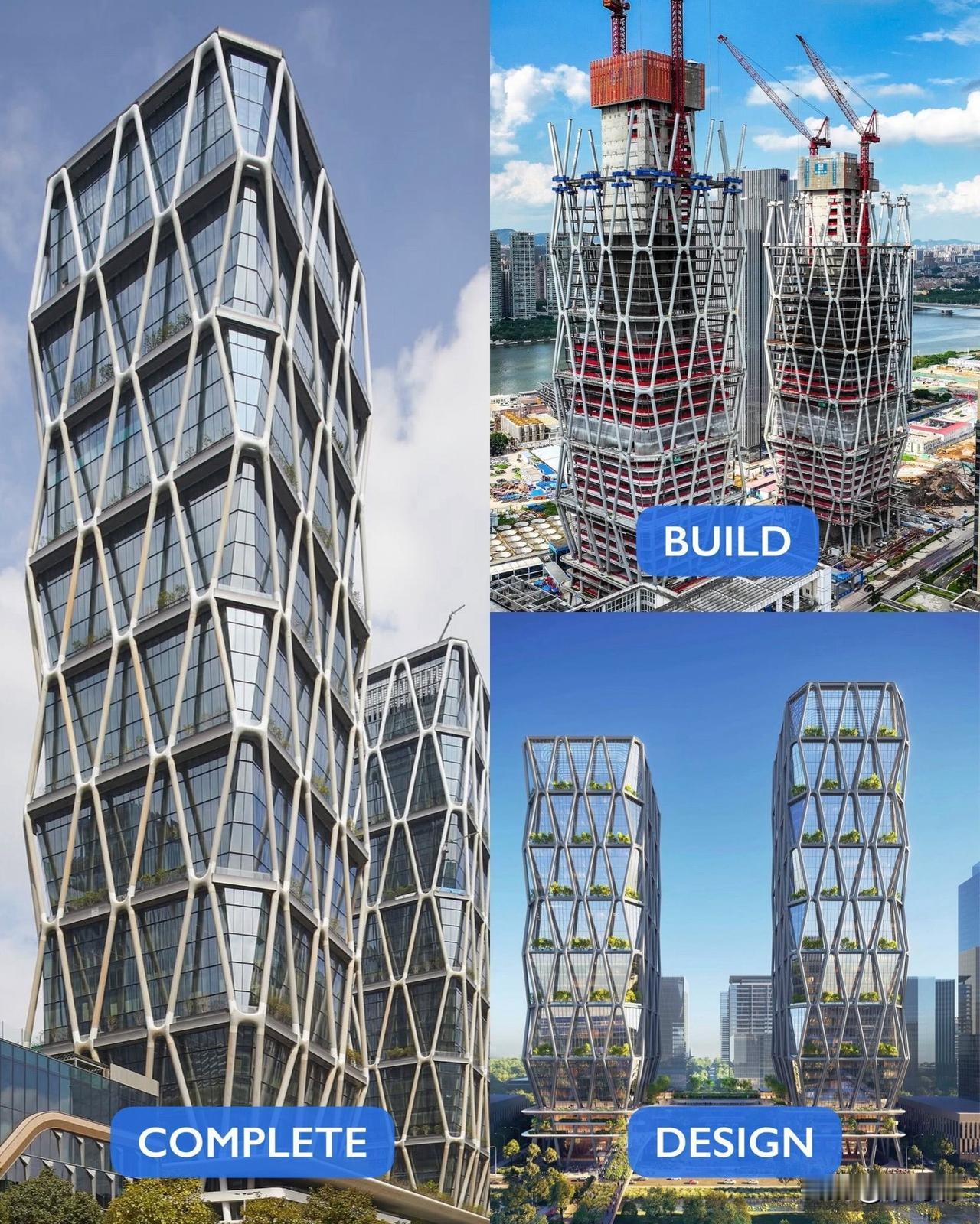 三一树根互联总部大厦(Sany IROOTECH Headquarters) 这座综合体包含两栋超高层办公楼,主塔楼(树根互联全国总部大厦)高约204米(也有来源称205米),副塔楼(三一集团华南总部大厦)高约181米。建筑采用了独特的斜交网格结构(diagrid structure),这不仅提高了抗震性能,还有助于最大限度地减少内部柱子,从而最大化室内视野并提高施工效率。 位置与设计:大楼位于广州市琶洲商务区,坐落在一个高架裙楼和公共广场上方,裙楼跨度达65米,连接两座塔楼。这一设计旨在将商业空间与城市公共区域融合,创造出一个“空中生态之城”的概念。 该项目由全球知名的建筑设计公司 Skidmore, Owings & Merrill (SOM) 设计。项目已于2023年主体结构封顶,预计将于2025年全面竣工。