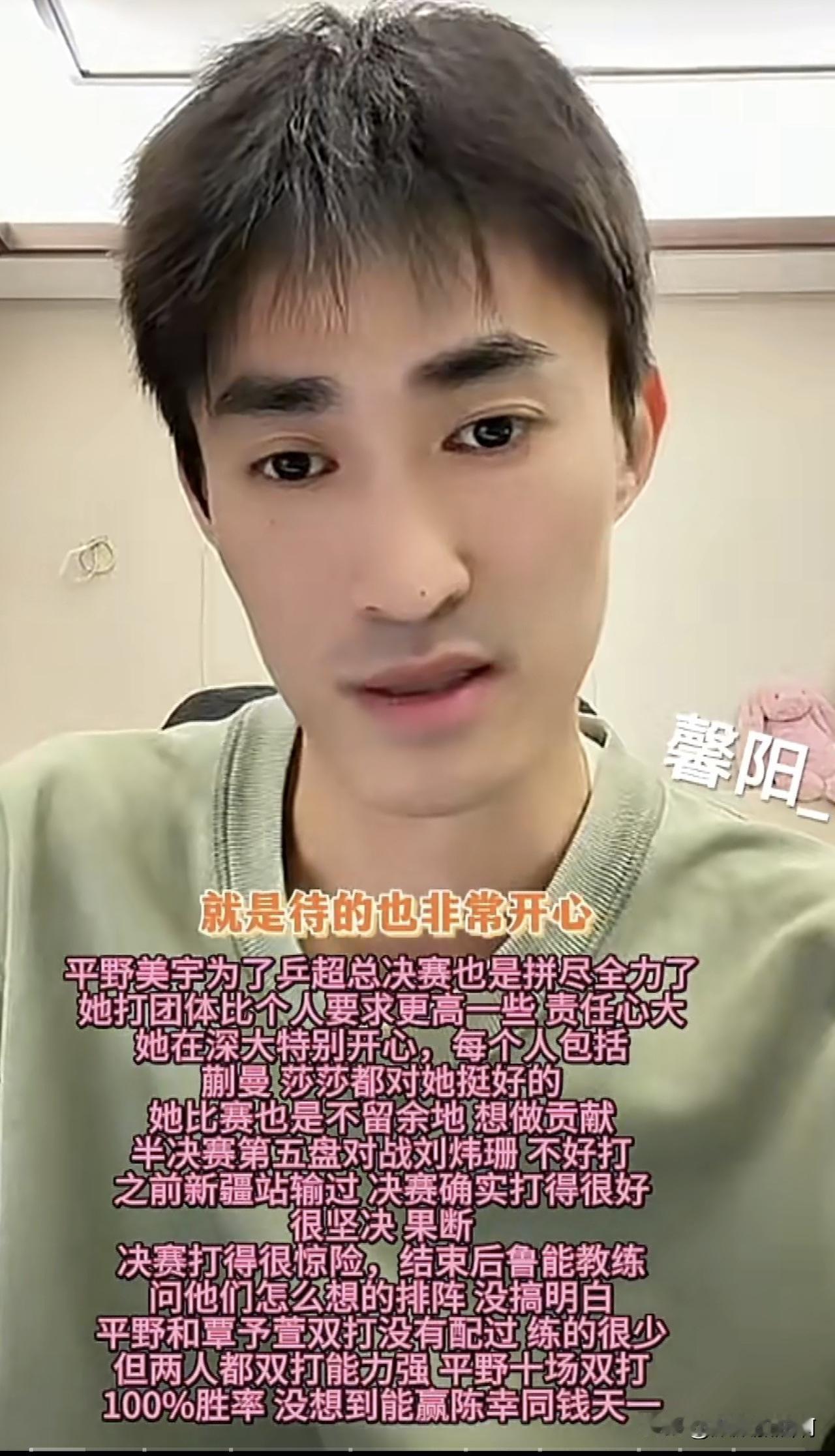 平野教练张成透露,平野打乒超有3件事特别“开心”: 平野说队友融洽开心: 在中