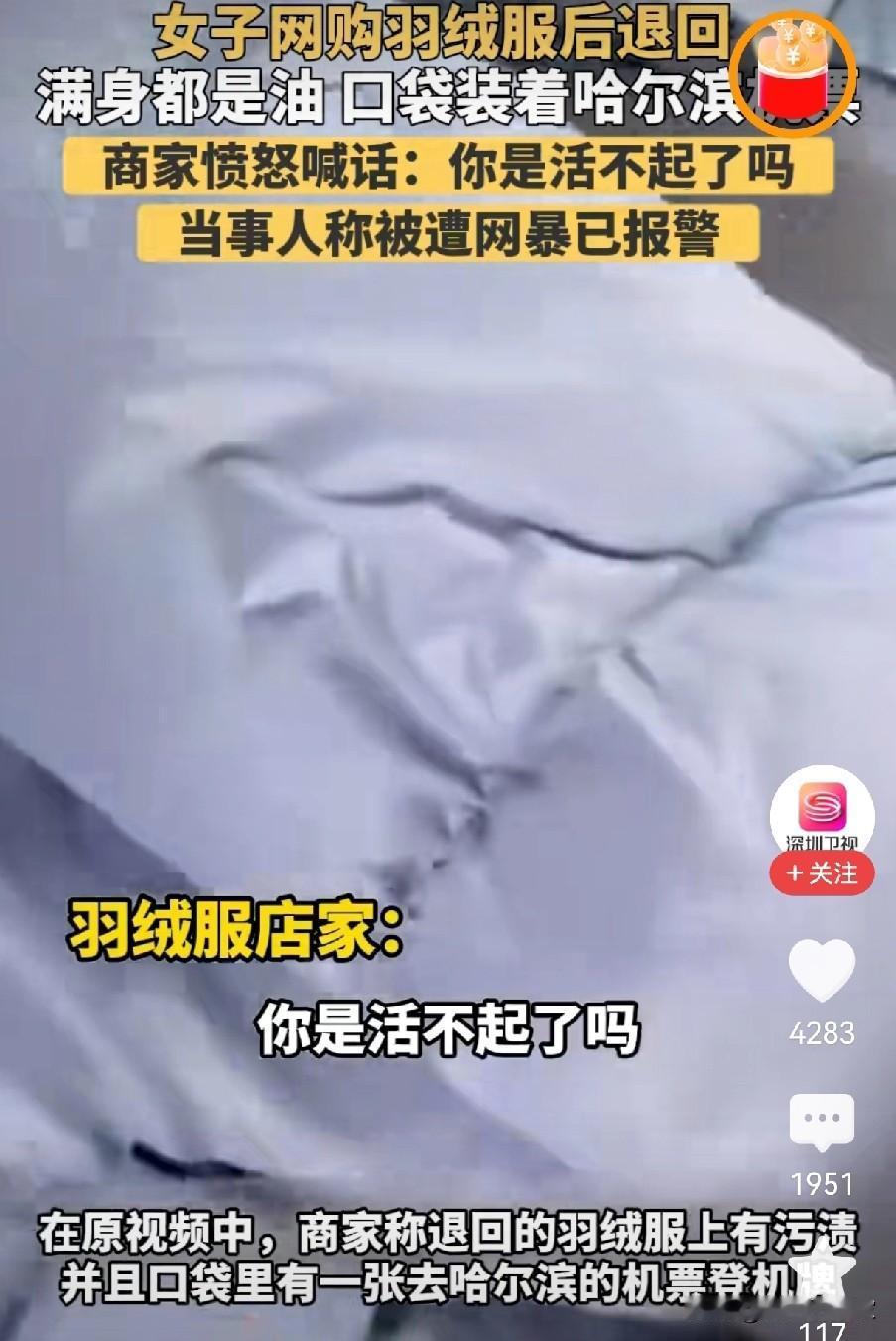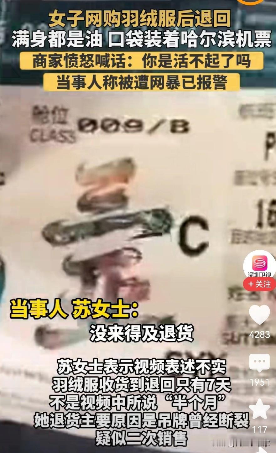 12月27号,浙江一个商家发的吐槽视频直接火了!海南三亚一个顾客网购了件羽绒服,穿去哈尔滨玩了半个月,衣服都造得脏兮兮的,转头就申请退货。 商家气到不行,一句“你是活不起了吗”直接冲上热搜。本来就是个买卖纠纷,结果商家把顾客的隐私信息也曝出来了,这下可好,顾客直接被网暴,最后只能报警。 到了12月30号,涉事商家又发抖音回应,说顾客已经主动联系了,双方已经和平解决,恳请网友别再揪着这事不放。可网友们不买账啊,纷纷吐槽:“这退回来的脏衣服,要是再拿出去卖,才是真正二次销售吧?” 这事说起来真的离谱,顾客一边说衣服吊牌有问题,疑似二次销售,一边又穿着它去哈尔滨旅游打卡,回头还理直气壮退款。这不是明晃晃的“白嫖”是啥? 现在网上这种人真不少,一到旅游旺季就网购冲锋衣、羽绒服,穿完一圈拍够照片,反手就退货,连租衣服的钱都省了。再看这商家,本来占着理,是妥妥的受害者,结果脑子一热曝光顾客隐私,直接从“维权方”变成“侵权方”,反而把自己坑进去了。 说到底,“7天无理由退货”本来是保护消费者的好政策,现在硬是被一些人钻了空子,变成了“免费试用”的工具。 眼下双方是和解了,但这事扯出来了更多的话题,无理由退货的边界到底在哪?商家维权的底线又该怎么守?怎么分清是合理退货,还是恶意白嫖?这些才是最矛盾的地方。