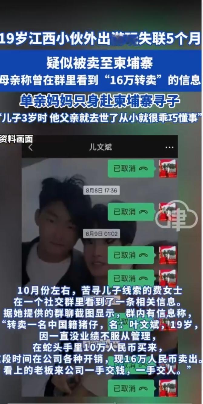 单亲母亲闯柬寻子:19岁儿子赴“同学之约”后成16万“商品” 12月的柬埔寨街头,费女士攥着儿子叶文斌的照片在人群中穿梭。这位来自江西上饶的单亲母亲,鬓角已染霜华,五个月来的奔波让她瘦了二十多斤,而社交群里那条冰冷的“转卖信息”,成了她心中最刺骨的利刃。 故事始于7月28日,19岁的叶文斌告诉母亲,要去南昌找同学。费女士未曾多想——儿子曾在南昌做过半年地铁安检员,这座城市对他不算陌生。可她未曾料到,这竟是母子间最后一次寻常告别。 7月30日,一通来自云南边境的陌生语音打破平静,对方用儿子微信告知“孩子想要出境”,费女士急请遣返,却只得到“只能劝说”的答复。当晚最后一次视频通话后,叶文斌的定位开始在普洱、昆明、西双版纳间跳跃,微信里那句“被骗到国外就不受中国法律保护了”的叮嘱,只换来儿子“我知道”的敷衍回应。 8月7日,微信消息石沉大海,电话关机的提示音让费女士彻底崩溃。报警后警方追查发现,叶文斌8月1日已抵达广西靖西,入住酒店后竟遗留行李,与同伴乘车直奔龙邦口岸,最终轨迹指向柬埔寨。 更让人心碎的是10月的一条群聊线索:“转卖中国籍叶文斌,19岁,10万买进16万卖出”,配图中儿子面部淤青、手臂带伤。费女士凑齐3.5万美金赎金,却被告知儿子已被二次转卖。 如今,在柬泰边境的安全警示声中,费女士孤身奔走,向使馆求助、在街头寻访。这个将儿子从3岁抚养成人的母亲,面对跨国贩卖的黑暗链条,唯有一腔孤勇。她盼着知情者能伸出援手,让那个赴约的少年,早日挣脱枷锁回到母亲身边。寻亲儿子 郑思维女儿