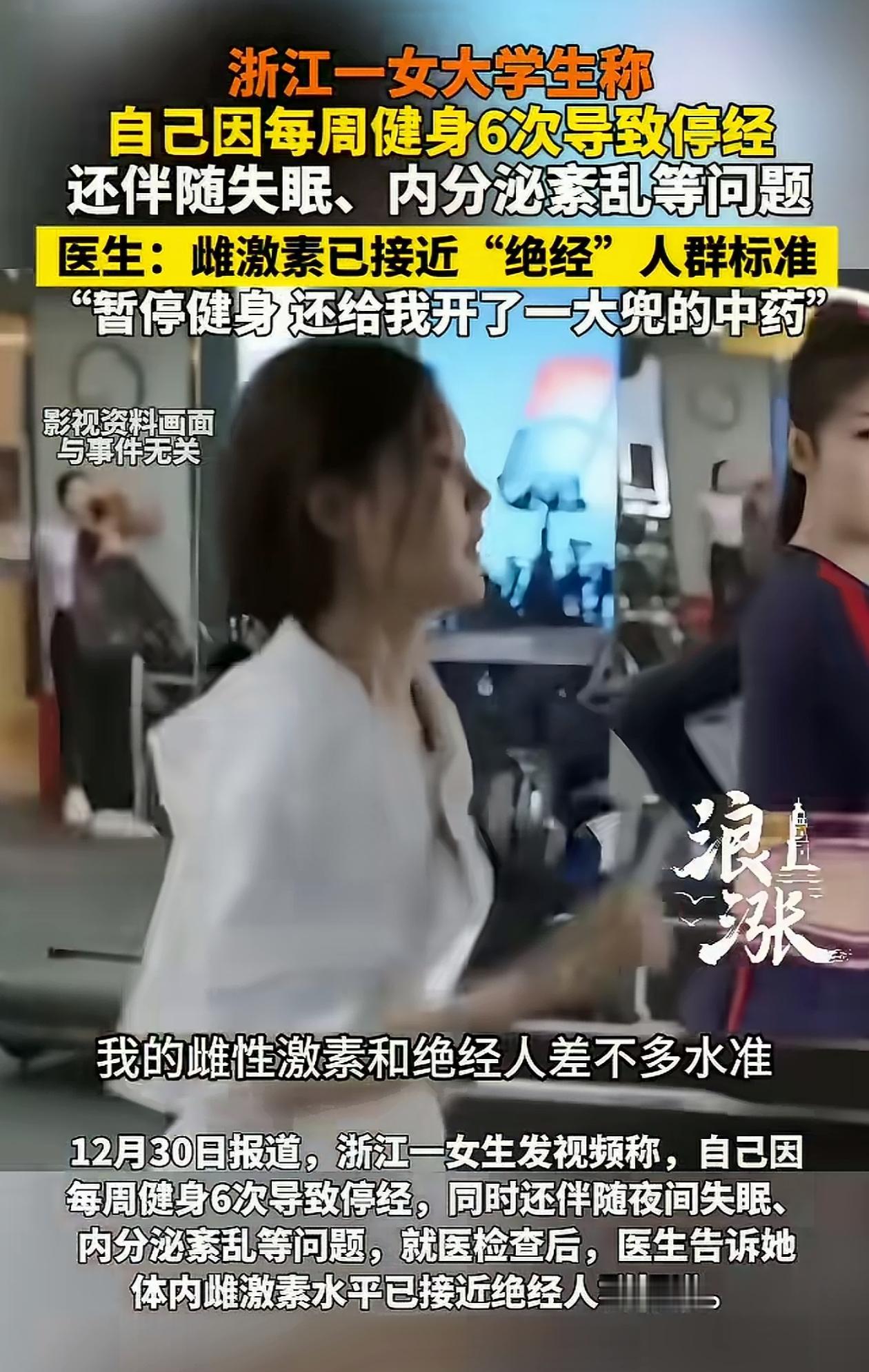 浙江一女大学生称 自己因每周健身6次导致停经 还伴随失眠、内分泌紊乱等问题 医生:雌激素已接近"绝经"人群标准",暂停健身, 开了一大兜的中药 女性的身体是特别需要脂肪的,脂肪过少会影响雌激素,也必然会导致内分泌紊乱,别把自己跟男性进行横向比较,认为既然男的能练到非常低的体脂率看着好看也没什么健康问题,女的就也可以,其实男的练的太过了都有肾虚的问题,女的锻炼强度过高频率过密导致出现内分泌问题也是必然的