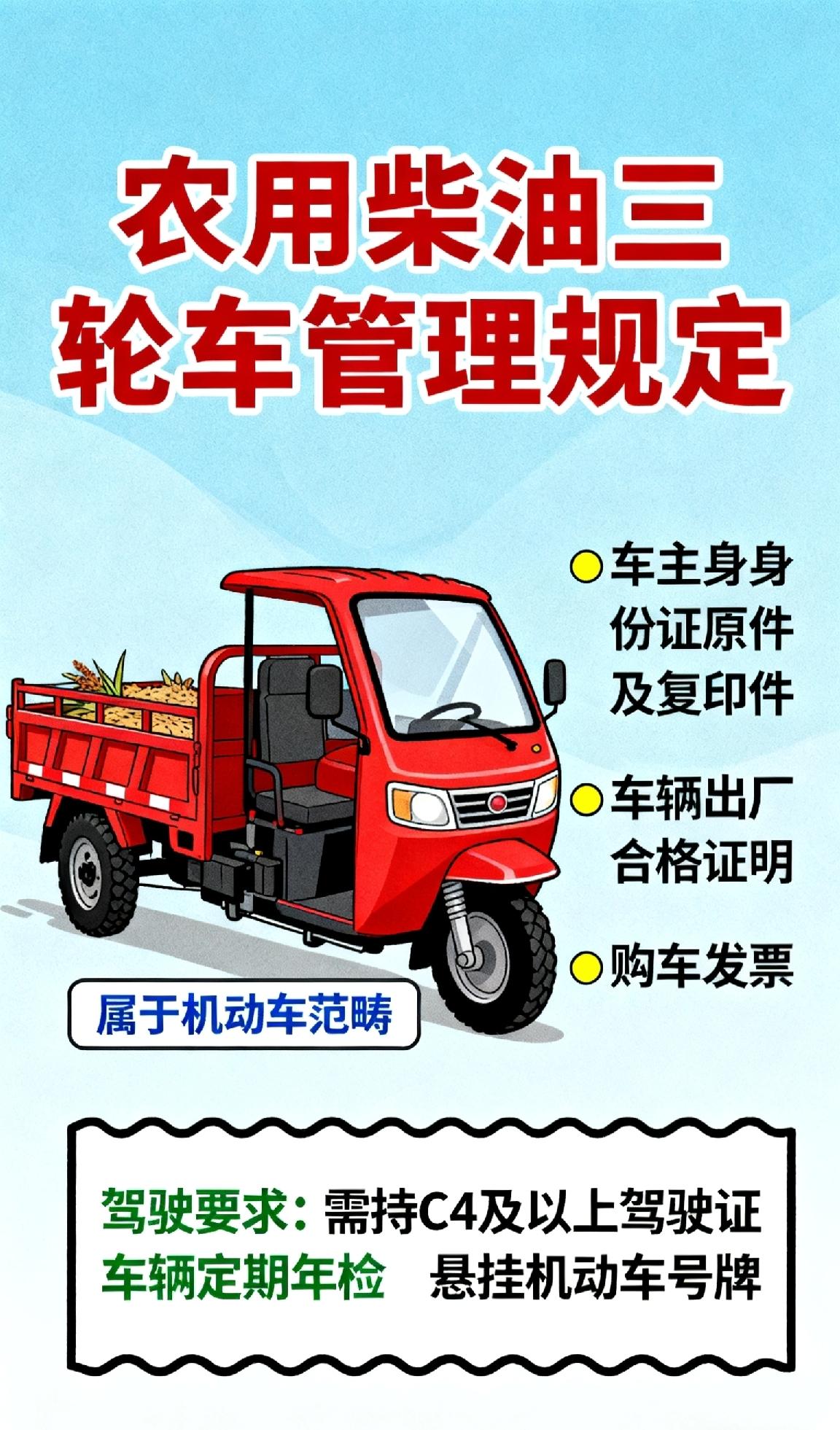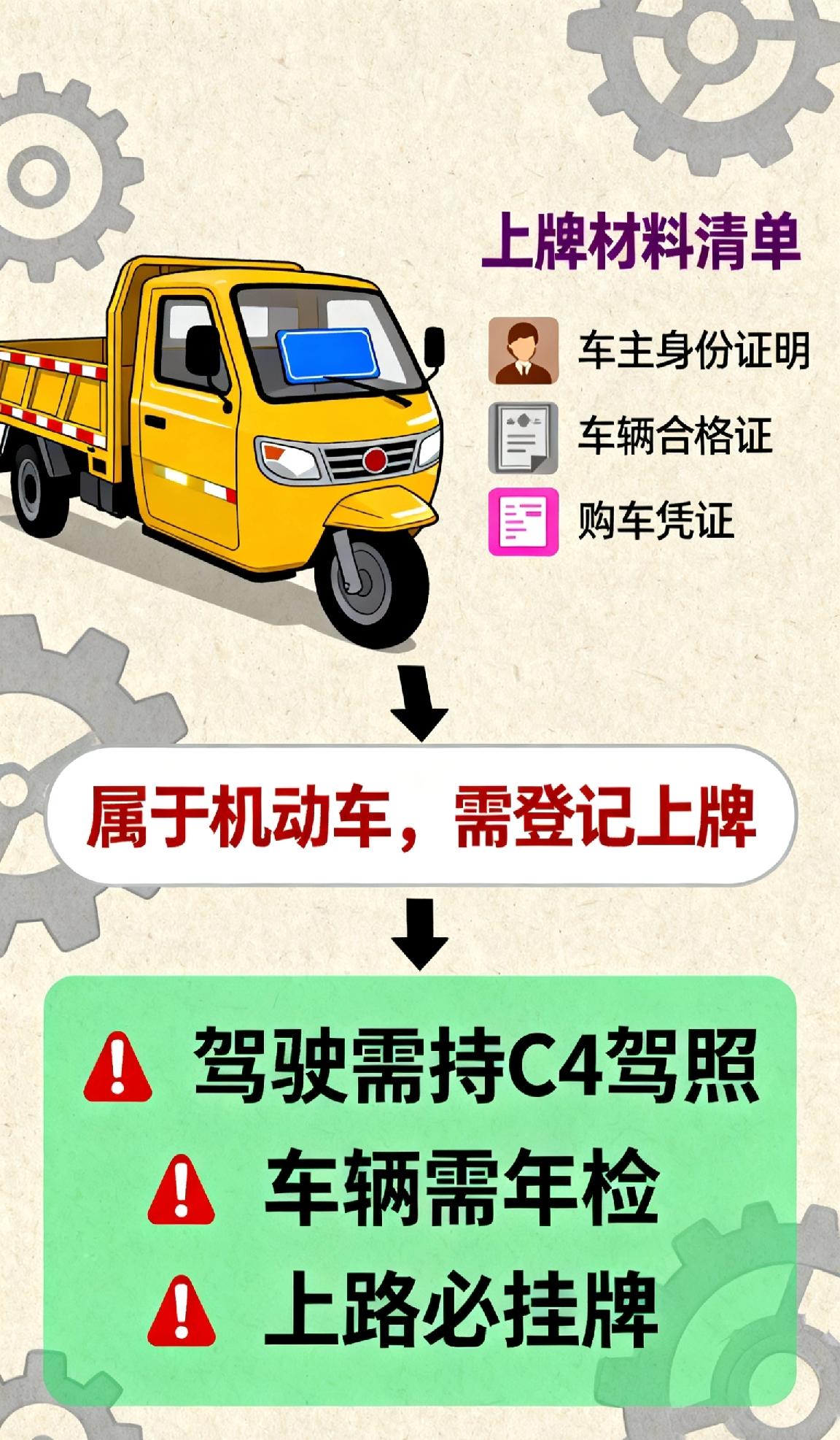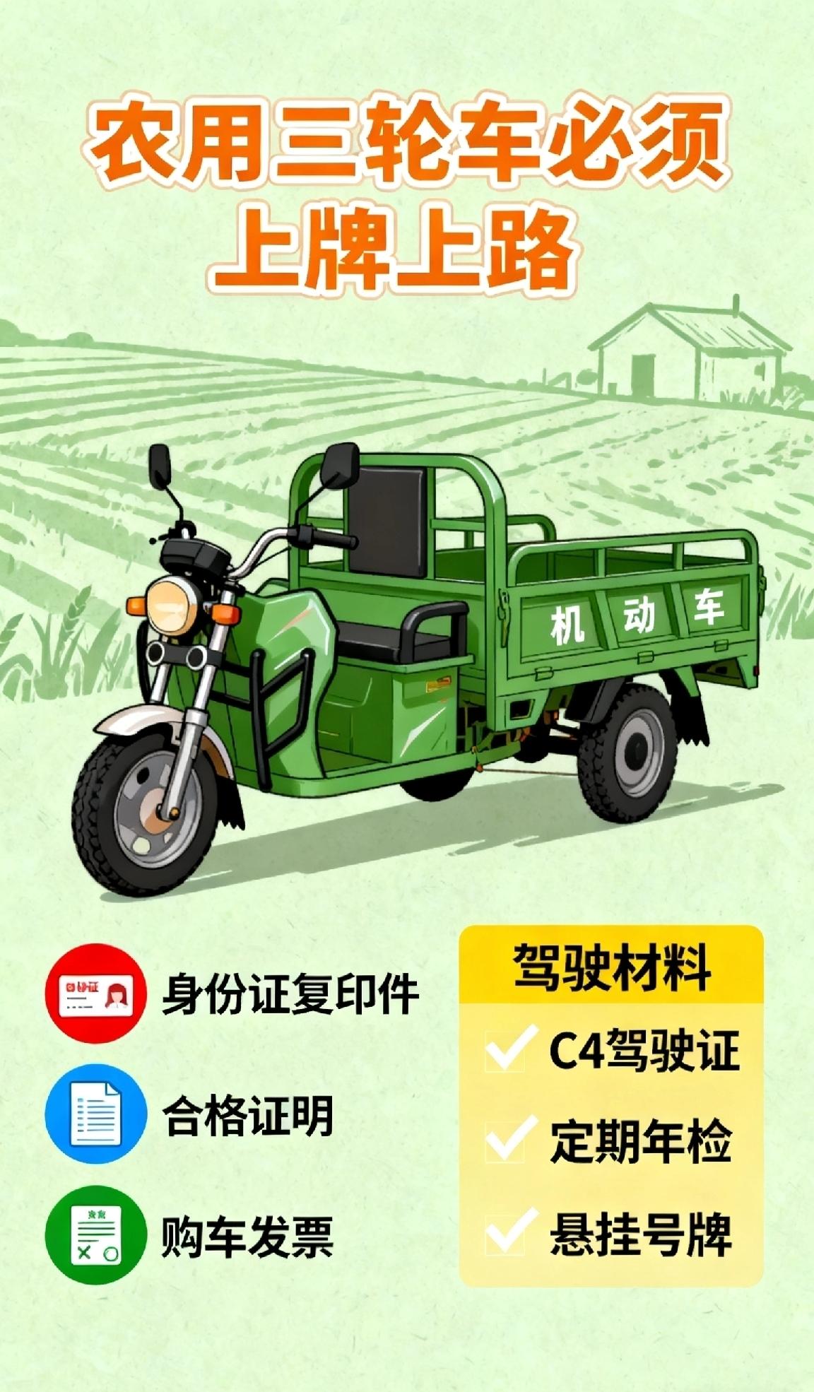 要上牌吗? 农用柴油三轮车必须上牌才能上路,它属于机动车范畴,需按规定在农机部门或车管所办理注册登记,悬挂绿底白字专用牌照。 上牌需携带身份证、购车发票、车辆合格证、交强险凭证等材料,部分地区需购置税证明(可能减免) 。驾驶需持C4或G照,纯农田作业不上公共道路的可免驾照和交强险。农用柴油三轮车 三轮车上牌 机动车上牌攻略 农机上牌指南