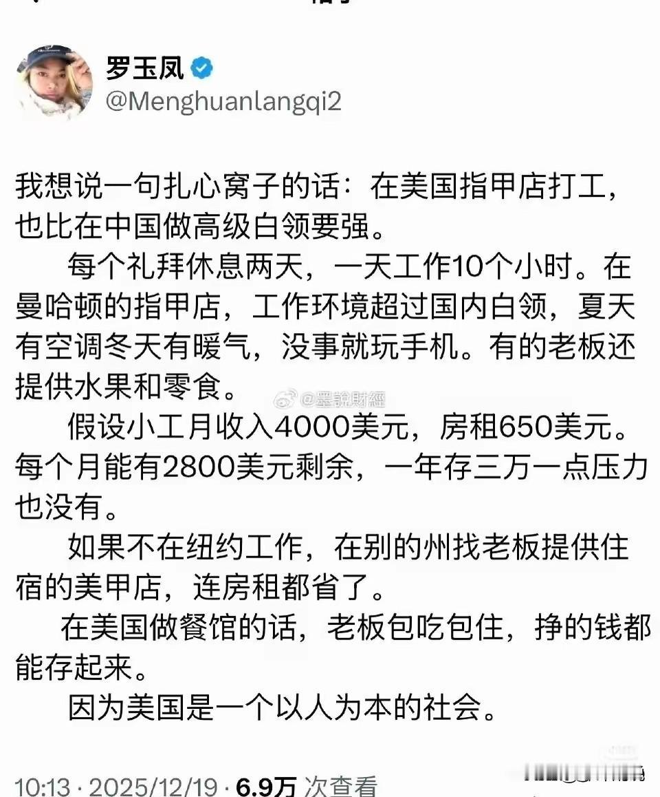 听凤姐一席话真的是豁然开朗,那些消失在美国“斩杀线”的人绝对是“大冤种”,看看美国工作福利多好,只要一个星期工作五天,一天10个小时,几年后你就是美国中产了。 不多这怎么和公知们说的不一样呢?不是美国是五天八小时吗?这凤姐为啥一天要工作10个小时?这不是在打公知和殖人们的里脸吗?[捂脸]
