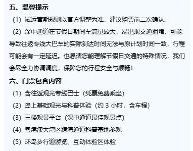 【每天900个名额!深中通道西人工岛正式开放上岛参观】历经两个月试运营之后,深中通道西人工岛正式开放上岛参观,根据介绍岛上参观是付费限量的,每天900个名额! 需要注意的是,本次上岛参观暂不支持自驾,游客需要乘坐接驳大巴上岛观光。目前只有深圳人民大厦、前海湾跨市公交接驳站、中山博览中心站三个站点有专门的大巴登岛,而南沙目前并没有上岛的接驳点,需要去到以上的三个点再换乘。 费用方面,三个点费用一致,成人票为188元,学生票为158元,小童票128元,优待票为128元。每日专线加密至6班,高峰时段 “人满即发”。目前可以看到元旦期间部分点的票已经售罄。 根据介绍,岛上设有湾区跨海通道科普基地,可以沉浸式了解工程建设历程,亲眼见证图纸变现实的硬核科技;另外新增 VR 大空间体验区 + 海盐特饮,可以一边叹咖啡饮料一边看日落。未来还将开通海上航线、低空游览等升级玩法! 需要注意的是,门票仅包含基础观光和科普体验项目,其他VR大空间等属于收费项目。 想要去试试的可以通过 “深爱票” 小程序预约名额。
