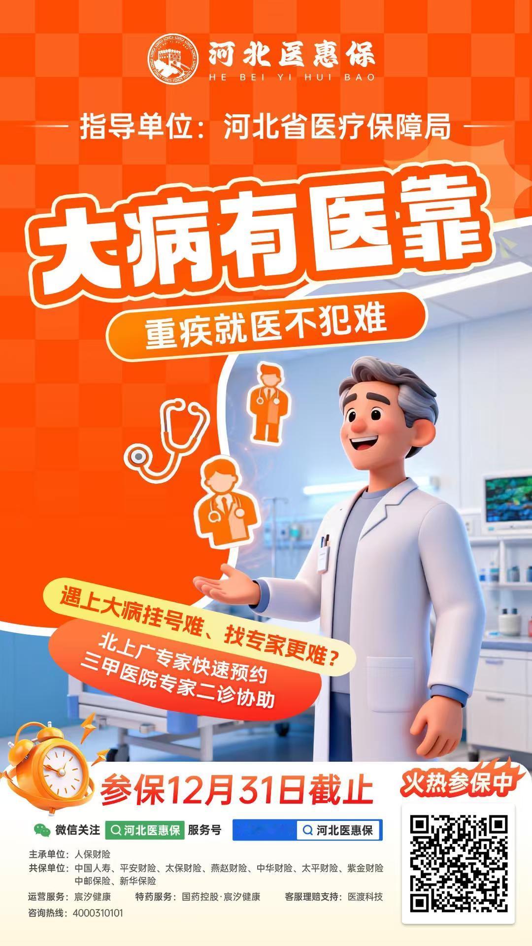 过日子谁不想顺顺当当的,可家里有老人小孩的,就怕个头疼脑热往医院跑。检查费、手术费,还有那些对症的特效药,真要花钱的时候,心里多少都得打个鼓。 好在有河北医惠保,政府指导的惠民保险,主打一个实在。只要有河北基本医保就能参保,没年龄限制,刚出生的娃、百岁老人都能投;也不挑职业,不管是上班的、种地的都能入,就算有既往病史也能保能赔。保费也划算,最低一年才99块,一顿饭钱就能换来最高600万的保障。 保障范围也全,医保内外的住院费都能报,还包含95种全球特药和5种CAR-T治疗药,特药报销零免赔,正好贴合咱日常就医的需求。现在京津冀医疗协同越来越方便,二级以上公立医院看病,出院就能跟医保同步结算,不用自己先垫钱、跑断腿。 划重点!参保截止到12月31日,时间一到通道就关了。花点小钱给家人和自己添份保障,日子过得才更安心。