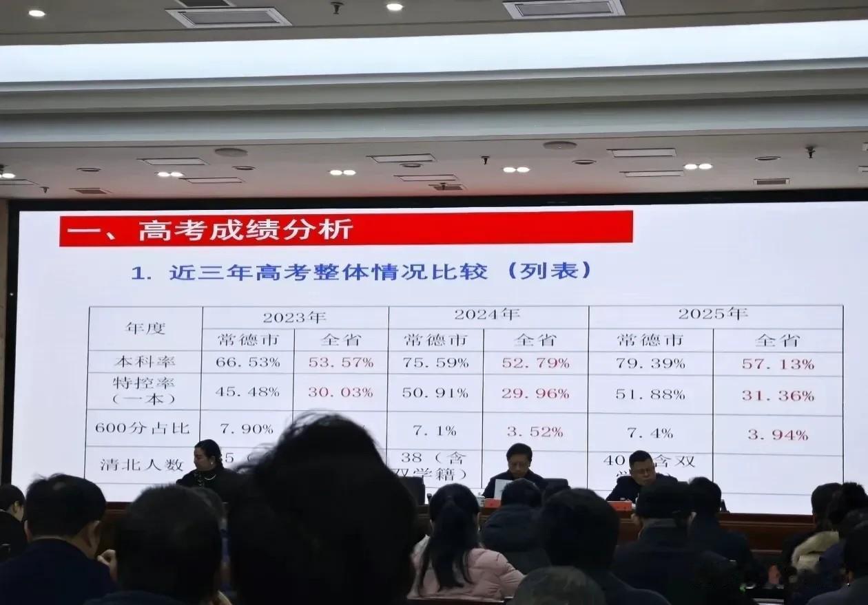 湖南省常德市近三年高考录取率情况。 近日,常德市教育局于高中教育总结大会上公布了本市近三年高考数据,各项指标均大幅超越全省平均值。 常德市教育实力着实强劲,长期稳居湖南教育第二城之位,整体实力仅逊色于省城长沙,市内有多所实力雄厚的高中。 近年来,为提升湖南省高中教育的整体水平,充分发挥常德市优质教育资源的优势,省教育厅牵头组织常德市桃源一中、石门一中、鼎城一中等多所优质高中,对省内其他州市的省重点高中进行托管帮扶。 这也是对常德市基础教育的一种认可。