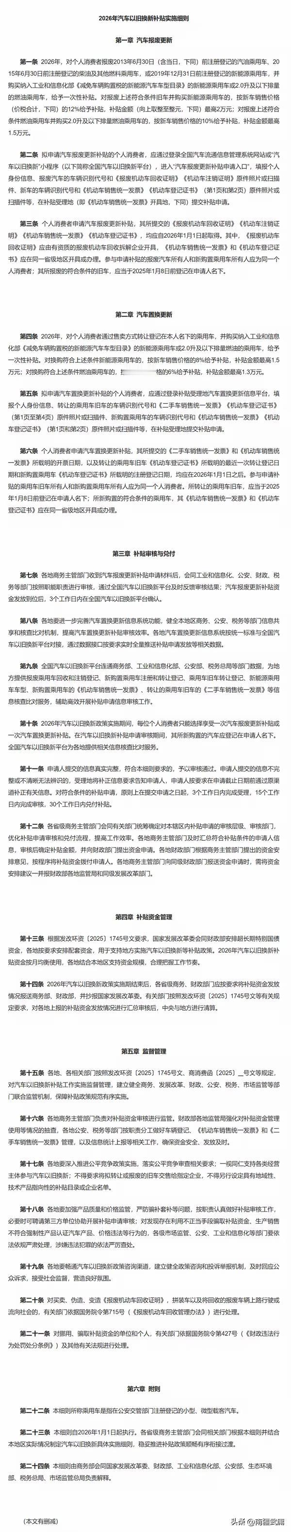 2026汽车以旧换新补贴细则出炉旧车登记有明确时限 12月31日,2026