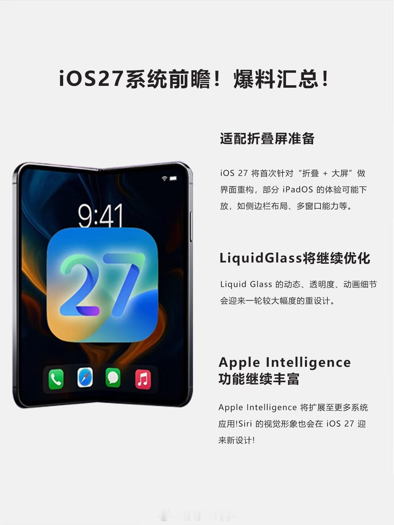iOS27前瞻来了不用期待了,iOS27不会放弃液态玻璃,反而会进一步打磨动画并且持续发力AI方面,Siri更智能,运动健康更人性化,但是在国行AI落地之前,这些更新等于没有同时iOS27会适配苹果的折叠屏,当年iPhoneX改变了全面屏的操作逻辑,不知道这次折叠屏会带来些什么