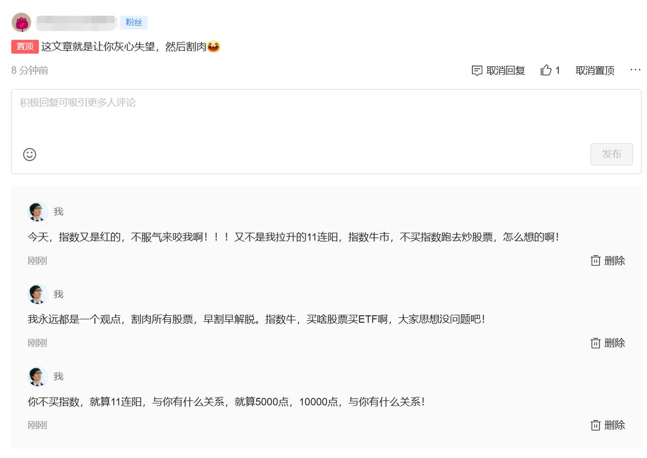 如果,大家不买指数,就算11连阳与你有什么关系,就算5000点,10000点又如何,与你有什么关系…… 指数牛市是明牌的事情,你不想持有指数,再不济得配那种涨跌幅和指数强相关的权重个股,这种股从来都是机构抱团,与大家短线炒股有什么关系。 今天,指数又是红的,不服气来争论啊。又不是我拉升的A股11连阳,指数牛市不买指数跑去炒股票,请愿赌服输,不就是侥幸的觉得自己能跑赢指数的收益。 告诉大家一个事实,今年的上证综合指数基金都有23%的收益率了,年初你清仓割肉所有股票换上证指数也是不错的收益率,大概率比你炒股强多了。 小凡的观点有问题吗?不能因为我的观点不能满足你去炒股的需求,就认为我有问题。我觉得自己没有问题,如果你也觉得没有问题,是不是可以自行离开了,我这里与炒股的内容没有任何关系。 如果,我说错了,大家可以批评指正,关键是大家怼的方向都是污蔑,这就让我们基民很难受了,我写自己的指数产品的策略,没有影响大家炒股吧,如果有影响,那也不是我的问题,我所有文章都只讨论指数分析…… 11连阳,又能如何?大家的股票涨了多少,12月份,如果我没有猜错的话,有近20天时间是3000家以上的股票下跌。所以,我写的东西对股民朋友们还重要吗? 我只是相信指数牛,持有指数产品,享受稳稳的幸福年,我好开心,我也好嗨,感觉人生快到巅峰了,今年创业,恒科,恒医都涨得好,是自己2025年利润的。其实,纳指、日经、黄金白银指数产品也涨得不错,只是我错过了……