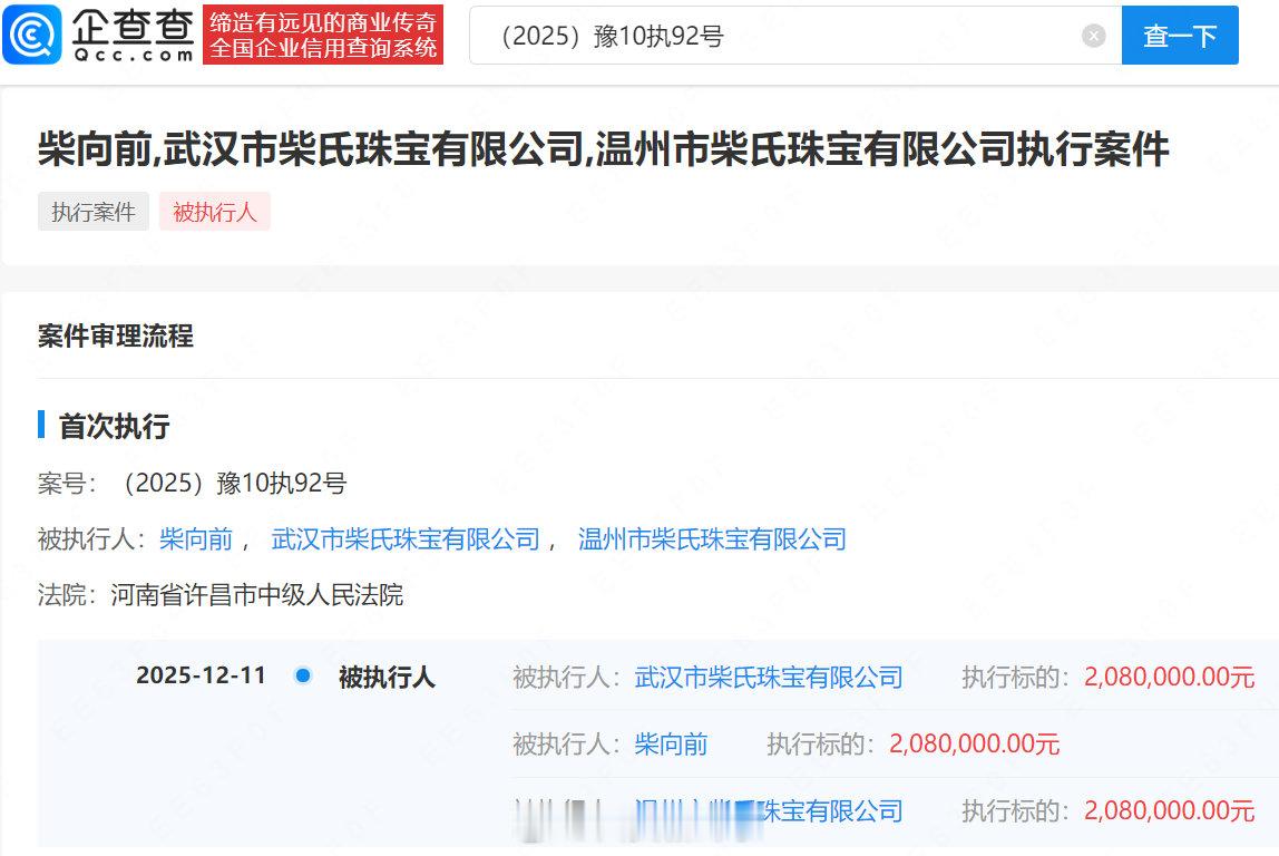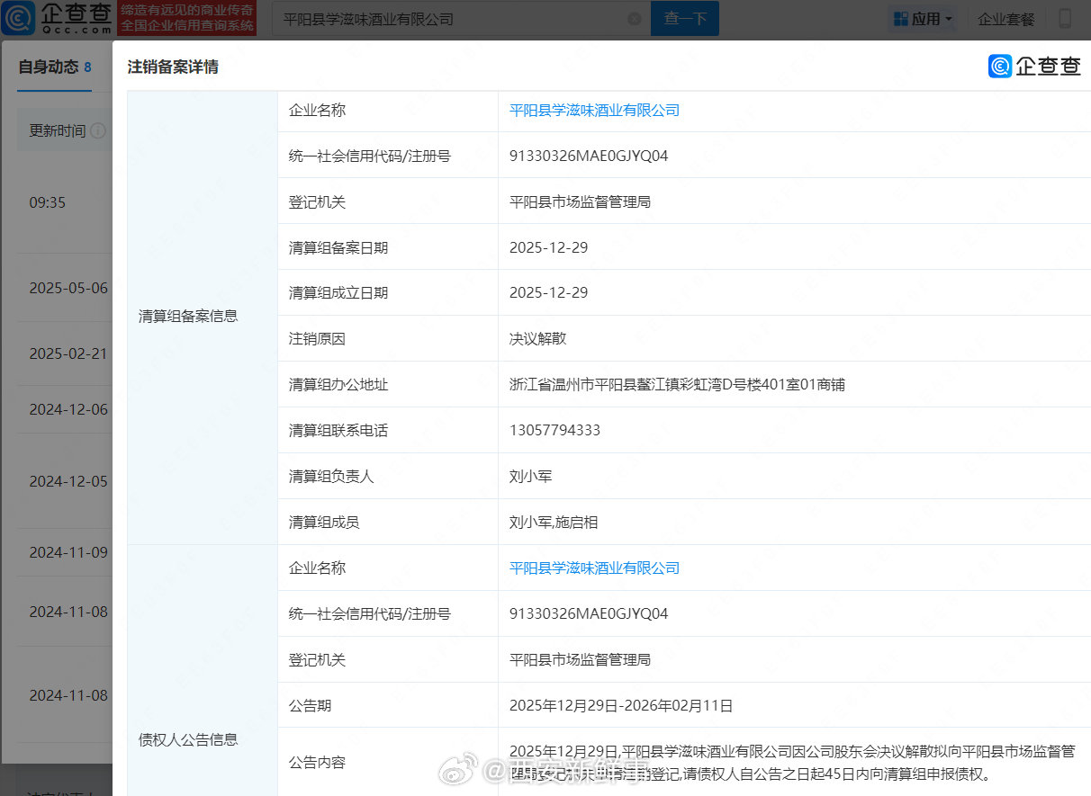 【网红柴怼怼公司拟注销】柴向前公司拟注销企查查APP显示,近日,由柴向前(网红柴怼怼)持股60%并担任法定代表人的平阳县学滋味酒业有限公司新增注销备案公告,公告内容为因公司股东会决议解散拟向平阳县市场监督管理局登记机关申请注销登记,公告期自2025年12月29日-2026年02月11日。该公司成立于2024年10月,注册资本为100万元,经营范围包含食品销售、食品互联网销售等。值得注意的是,今年12月,柴向前及其珠宝公司被执行208万。据此前报道,柴向前夫妇因涉嫌生产销售伪劣产品被逮捕。
