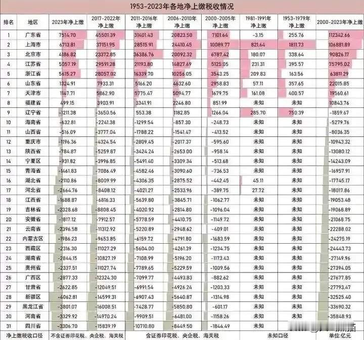 这张图很有意思, 从各地净上缴国家税收来看,广东不愧为经济大省,从80年代入不敷出到现在的绝对顶梁柱,也配得上现在经济大省的地位。 其次是上海市,也是绝对的上税大户,而且在80年代之前,缴税数额是绝对的领先。 山东省和天津市,在80年代之前缴费比例还是比较高的,从此之后逐渐的走了下坡路。不过比辽宁的数据要好一点,想当年,辽宁也是妥妥的,可在2000年之后就基本上看不到上缴税的影子了。