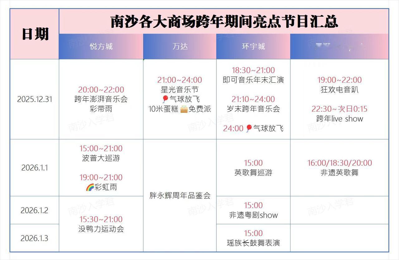 南沙四大商场跨年元旦活动大全!说真的论活动用心的话,还是得环宇城,和万达一样都有放飞气球雨,cocopark就是音乐live show,略显平淡。悦方城则是有彩带雨。 你会选择是哪个商场跨年呢?