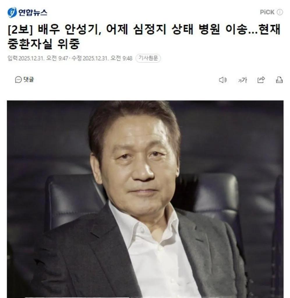 韩国演员安圣基因噎食被送重症监护室!2025年12月30日下午4点左右,73岁的韩国“国民影帝”安圣基在家进食时突发噎食昏迷,救护人员抵达后立即实施心肺复苏术,被紧急送往医院后转入重症监护室(ICU),截至12月31日仍处于“危急状态”,院方正密切监测其生命体征。当前院方仅通报病情危急,未发布预后信息。韩国演员安圣基因噎食被送重症监护室 安圣 噎食事故