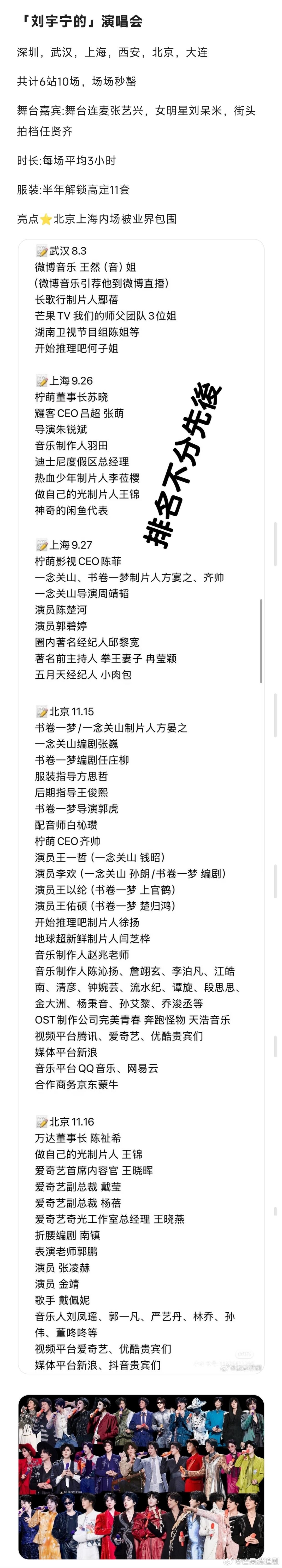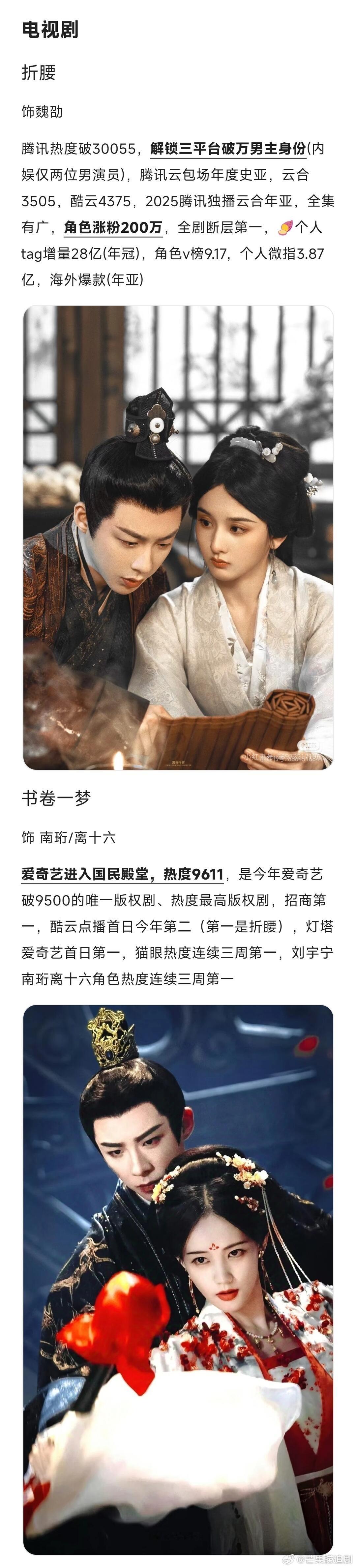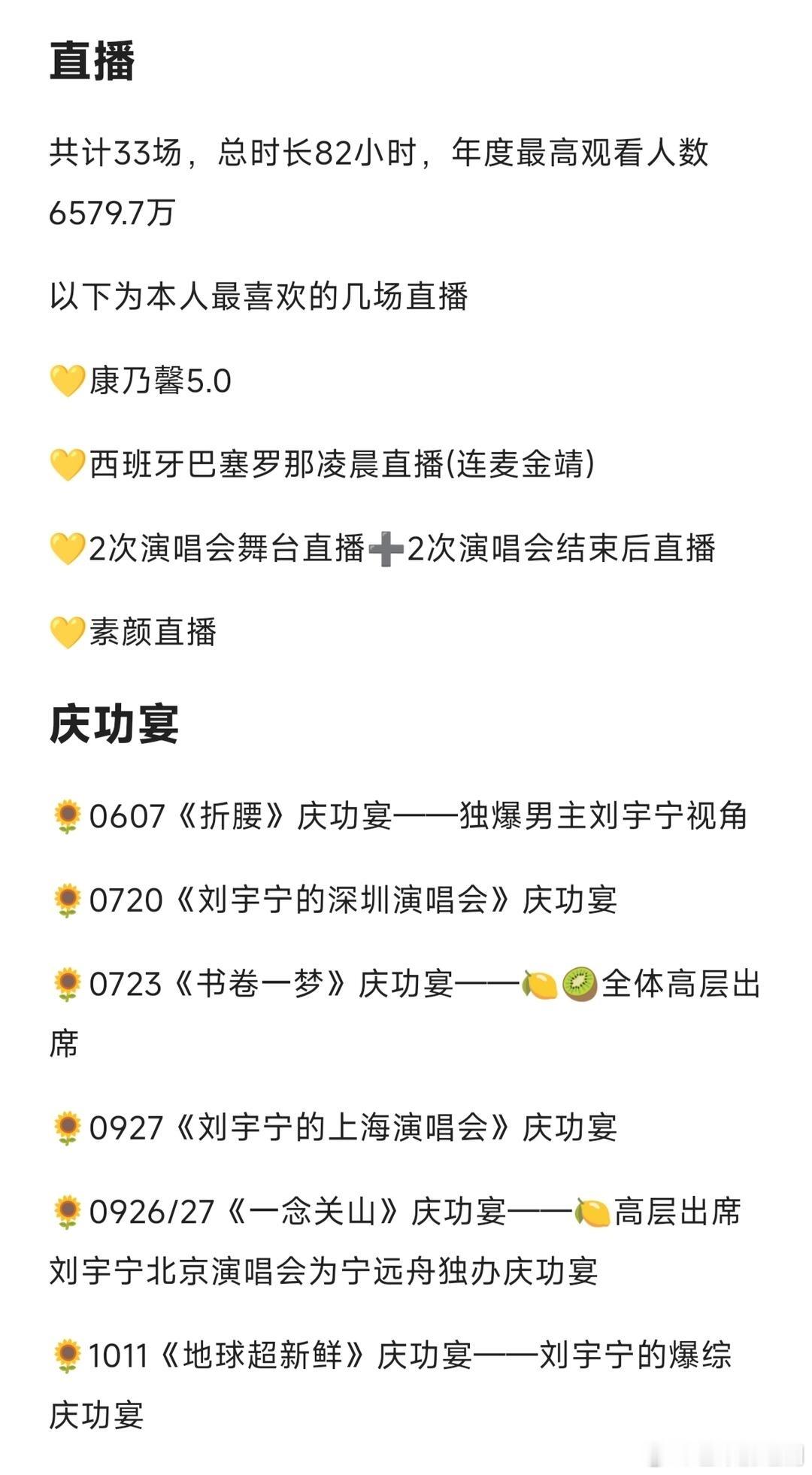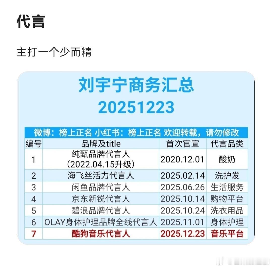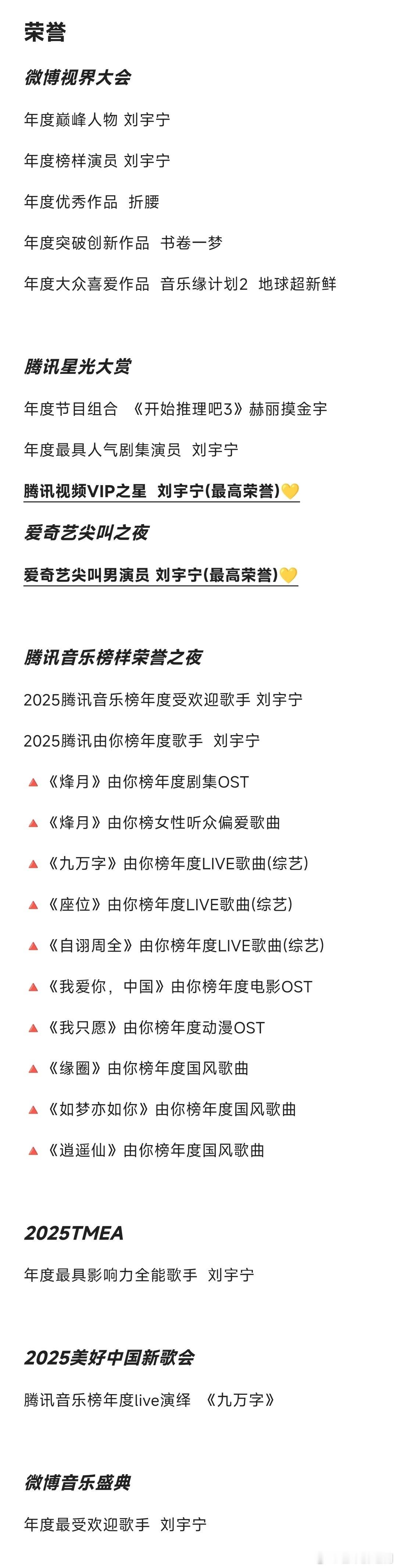 刘宇宁2025年工作汇总,影音综播全赛道通吃。音乐:全年发行单曲54首,周更级高频输出,乐坛高产标杆。「刘宇宁的」巡演8城开唱10场,场场门票光速秒罄,票房口碑双爆。影视:双剧爆款实绩封神,腾讯《折腰》热度破3万,饰演魏劭 角色热度破4亿;爱奇艺《书卷一梦》热度9611,入选国民殿堂剧集,创柠萌影视4亿创收,饰演南珩 角色热度破7亿;内娱唯一「双平台爆款+三平台破万男主」纪录。综艺:多档高分爆款在手,口碑热度双赢。《地球超新鲜》豆瓣8.2分,弹幕破亿,登平台拉新年榜高位;《开始推理吧3》同步入选拉新年榜,推理综艺实绩TOP;《音乐缘计划》舞台战神+团队核心,全程高光成节目王牌亮点;《天赐的声音6》飞行嘉宾,两首舞台斩获百万收藏TOP级音源成绩。商务:新增6个国民级代言,覆盖个护、生活服务、音乐平台等多领域,商业价值持续飙升。直播:全年25场个人专属直播,解锁「康乃音乐节5.0」专场,单场观看人次超6000万,弹幕互动量破亿,直播顶流断层领跑。荣誉:全年受邀出席25场主流颁奖礼+晚会,横扫音乐、影视双领域重磅奖项,实力加冕,荣誉满贯。