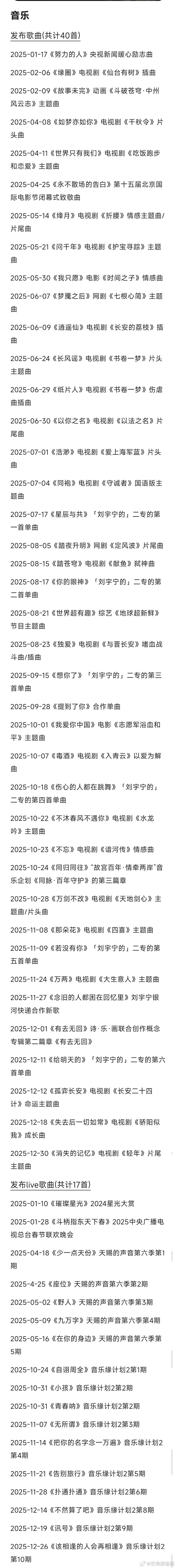 刘宇宁2025年工作汇总,影音综播全赛道通吃。音乐:全年发行单曲54首,周更级高