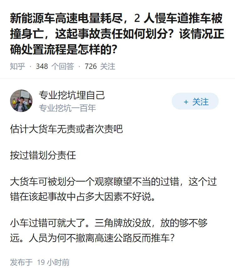 新能源车高速电量耗尽,2 人慢车道推车被撞身亡,这起事故责任如何划分?该情况正确处置流程是怎样的?