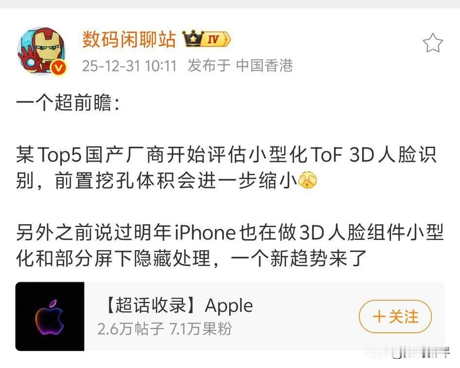 国产开始评估小型3D人脸,主要是缩小挖孔,看起来更加美观,iPhone这边也是这样设想的,可能在iPhone18系列上就会落地,最终形态可能是屏下3D人脸[思考]快的话27年底应该可以看见,不然就是28/29年了,昨天爆料是四曲屏+屏下3D,观感应该是满满的科技味[灵光一闪]定位就是高端旗舰