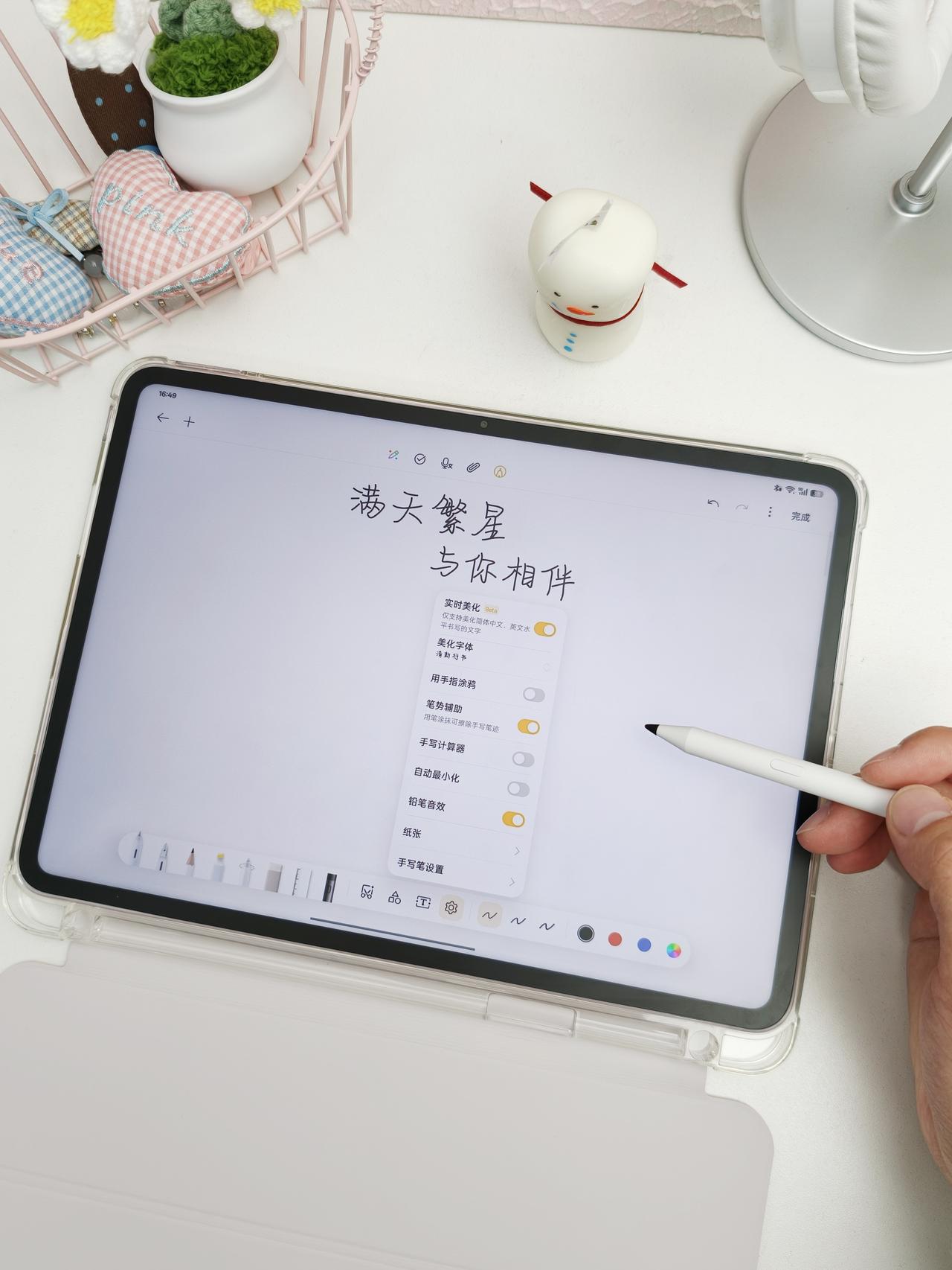 OPPO Pad Air5提前用上了,大家有啥想了解的? 首先很多人关心性能问题 我只能说是够用的,肯定比不上那些大几千的平板 但用起来是很流畅的,简单玩玩王者第五人格这些也是没问题的 我是主要买来无纸化学习的,感觉还是很不错的 平板的外观质感不错,带上送的壳也不会太重,带着无压力 柔光屏效果比网上看图的要好,几乎没有反光,比类纸膜好太多了 现在是有送手写笔的,还是官方的,写字基本没延迟 而且它还有个AI字迹优化功能,能实时优化字体,还能自动排版 我这种潦草人真的很需要了 另一个AI超级提取我感觉也很实用,网课视频里的图能直接截出来 刷课遇到重点的时候不用自己手抄,效果高不少 整体我是感觉挺划算的,国补后1.7k起,柔光版稍微贵一些 还送了壳跟手写笔,学生党拿来学习很够用了