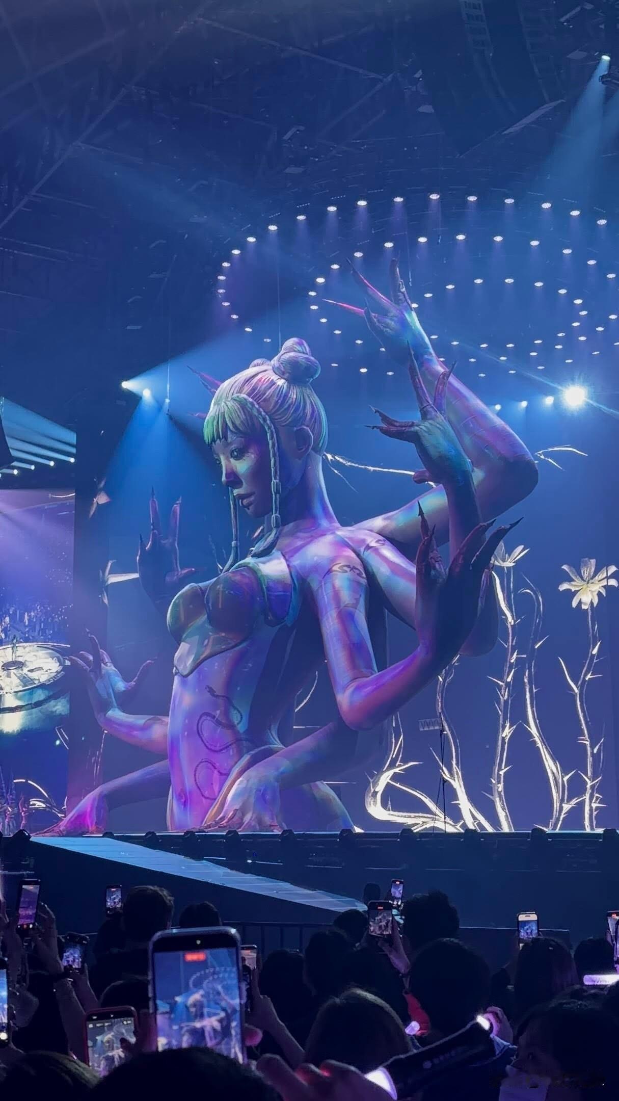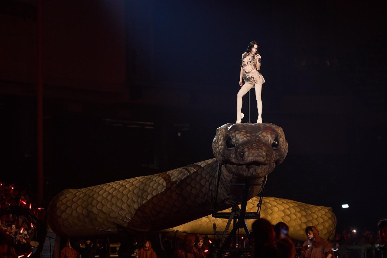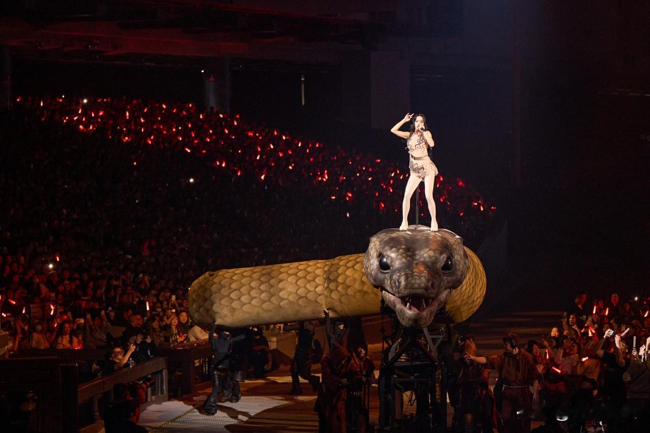 有点吓人,蔡依林30号在台北的演唱会被各种吐槽,网友说现场气氛太诡异了。 去查了一下才知道这场演唱会她花费了9亿台币【相当于2亿人民币】打造,现场的氛围又科幻又神秘,真的是巨资了! 看到了各种生肖,首先是蔡依林踩的巨蛇巡场的舞台设计,她踩在蛇的头部各种舞蹈降级了科幻片。 不光如此,还有巨型公牛游行,大金猪撒钱,像极了野兽公园。 大家喜欢看这样的演唱会吗?第一次刷到那么震撼的演唱会![笑哭]蔡依林 2025年就要过去你想说点什么吗