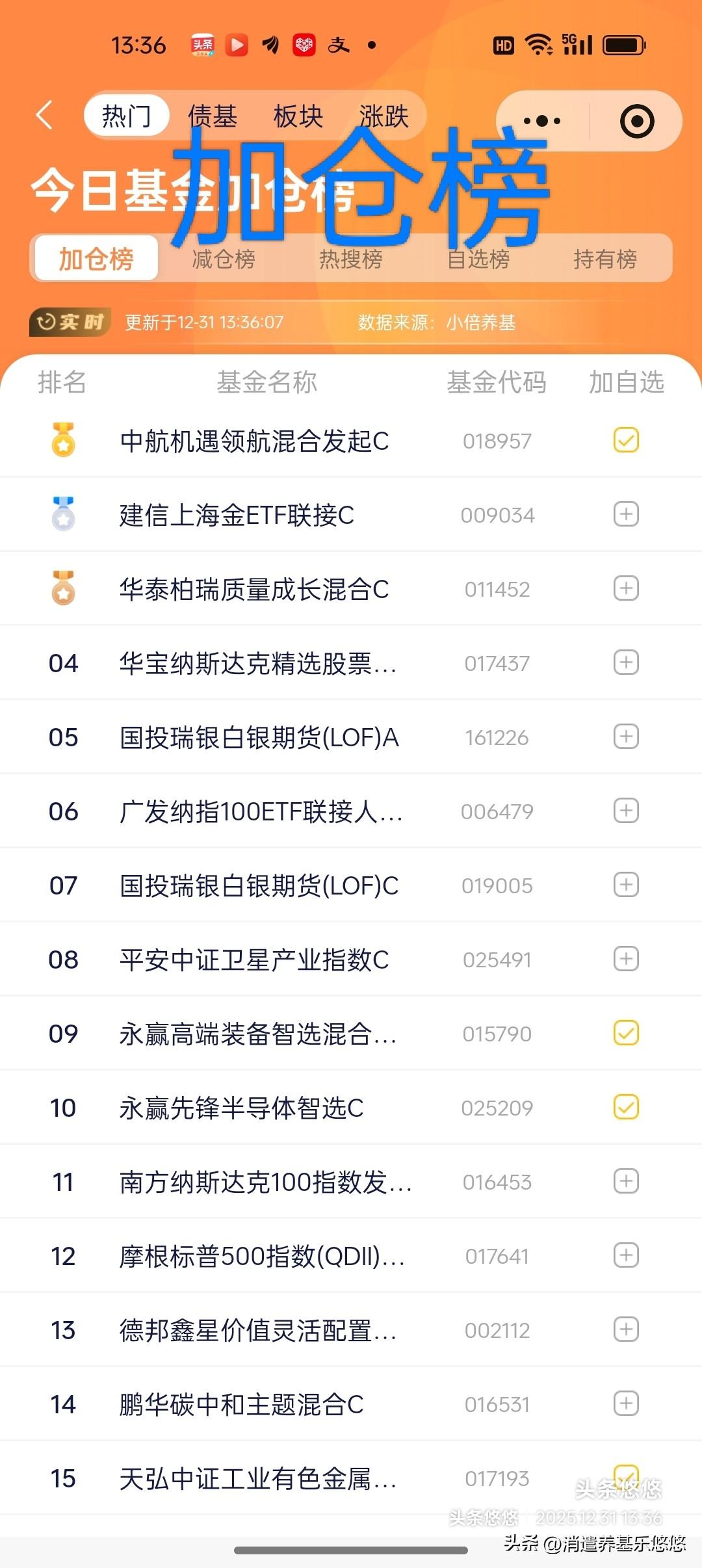 12.31日基金操作观点及加仓榜 今天是收官之战,上午资金博弈加大,进去的出来的都比较频繁,有的板块下跌比较大,期待节前红包没有到手,让人感到不平静,看下午表现吧,指数不会太难看。 .那些高标板块比如商业航天,卫星互联网通信,鱼尾行情,还是提前兑现利润吧,不建议再往里冲,想进的等年后回调。 恒生科技,如前面文章分析,仍然是走震荡整理行情,布局来年行情吧。 创新药,作短线点暂时远离,作中长线的,慢慢低吸布局。 人形机器人,持仓过节,止盈减仓,或者不动均可。 新能源电池板块,上涨趋势没有改变,继续持仓待涨。 有色金属,持仓待涨,大胆的可以适当追涨。 通信设备与cpo,回踩了10日线支撑,趋势有点变弱,稳健的观望不动,激进的适当低吸。目前中航机遇领航基金估值跌2.%。 存储芯片,短期头部迹象,收盘能站上5日线问题不大,可继续持仓待涨。轻仓的也可试错低吸,目前基金估值下跌2%。 科创芯片,目前收回来了5日线支撑,继续持仓待涨。 软件开发,持仓待涨。 动漫游戏,横盘震荡整理,持仓待涨,空仓的观望一下。 低空经济,高位震荡整理,分期止盈减仓。 中证军工,高位震荡,分期止盈减仓。 可控核聚变,午间发了分析去看看作为参考。目前10日线止跌企稳。 点赞转发关注投资理财不迷路。 本人持仓基金都是绿色,吃面! .