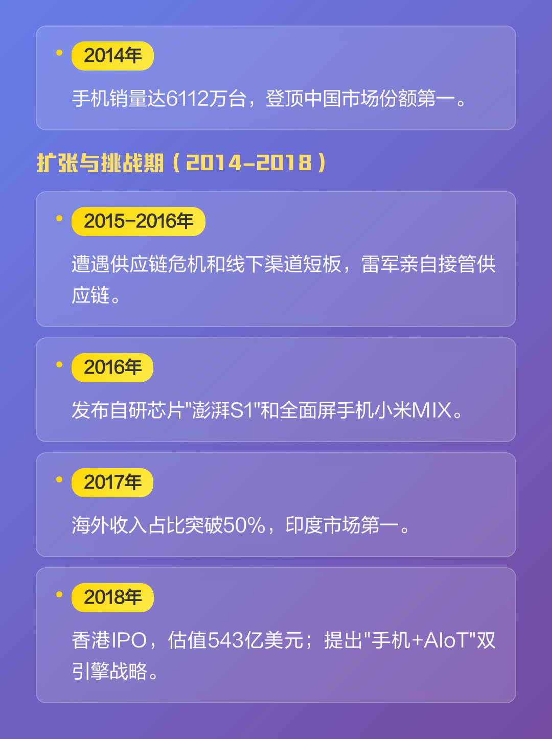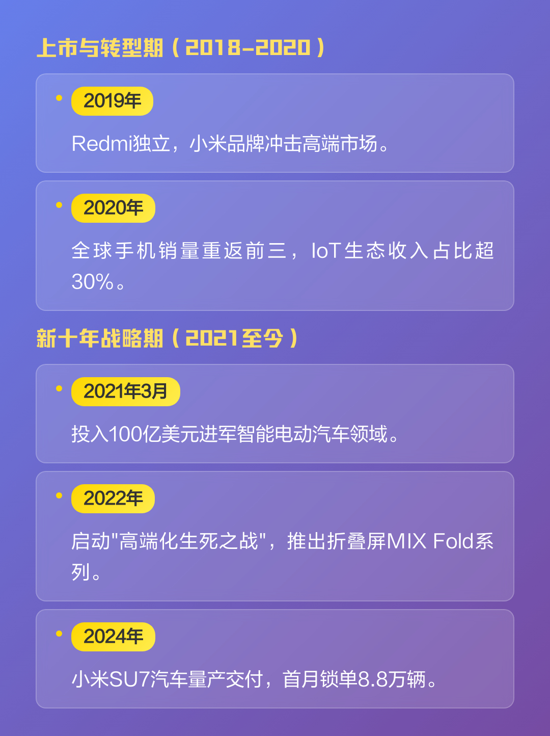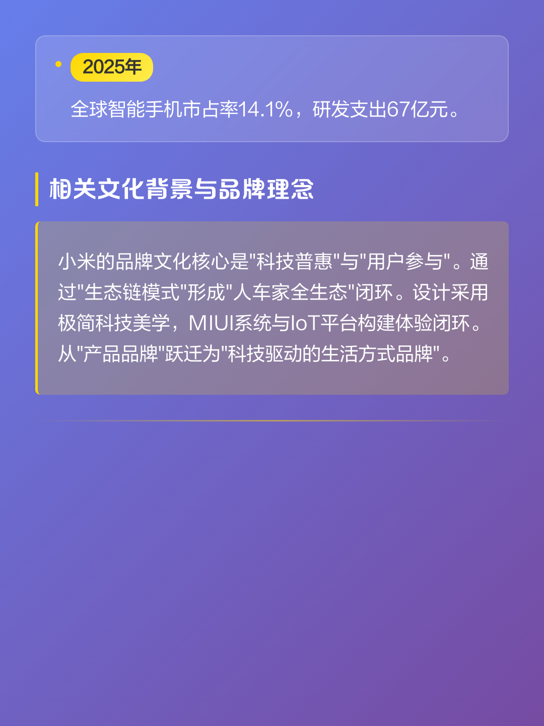 央媒年终盘点集体点赞小米 2010年4月,雷军联合林斌、黎万强等科技行业资深人士在北京创立小米公司。初期定位为“互联网手机公司”,目标是通过“高性价比硬件+互联网服务”颠覆传统手机行业。创始团队以“让每个人都能享受科技的乐趣”为使命,选择从智能手机切入市场,通过互联网模式降低中间环节成本,为用户提供接近成本价的优质产品。小米15年发展历程全览,感兴趣的可以了解一下。
