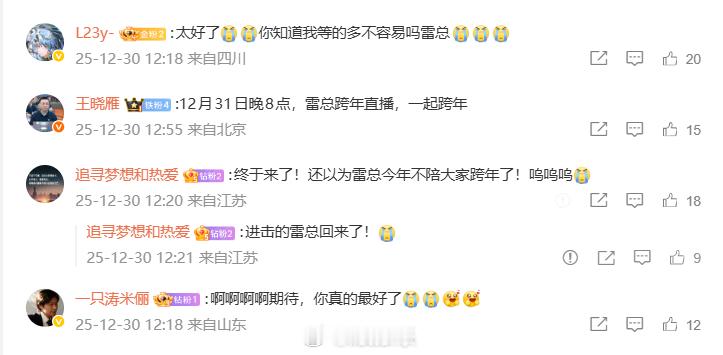 雷军宣布回归跨年直播,评论都是俺想你