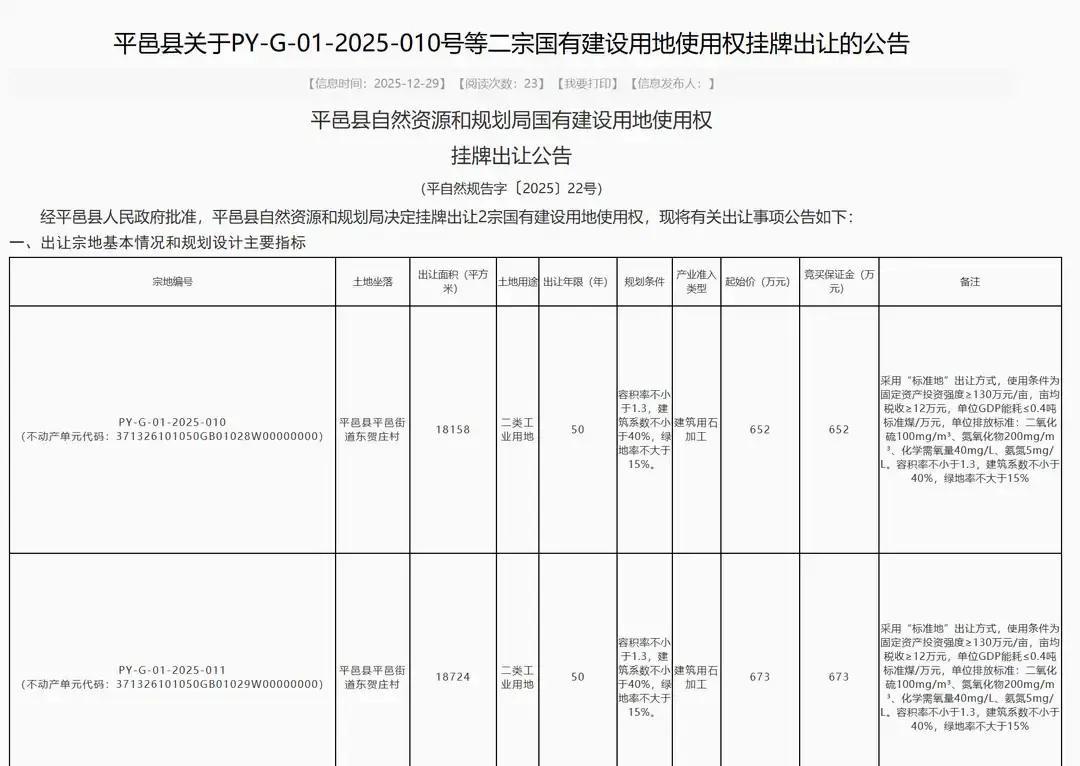 平邑县刚把东贺庄村两块工业用地挂出来,8万7千平,起拍价1325万,保证金就得先掏260万。 消息一出,本地群里炸锅,有人算了一笔账:按容积率 2算,能盖10万平厂房,要是做食品或五金,一年税收少说两三千万,县财政直接回血。 更妙的是,地块紧挨新修的国道,货车一脚油门上高速,运费省一大截。 村里老人关心的是空气别变差,年轻人盯着会不会招工,最好门口就能打卡上班。 现在离截止还有一天,三家报名,听说两家是外地老板,一家是本地做板材的,谁最后举牌,29号就见分晓。 地卖出去,票子进来,工厂冒烟,村子才有未来。