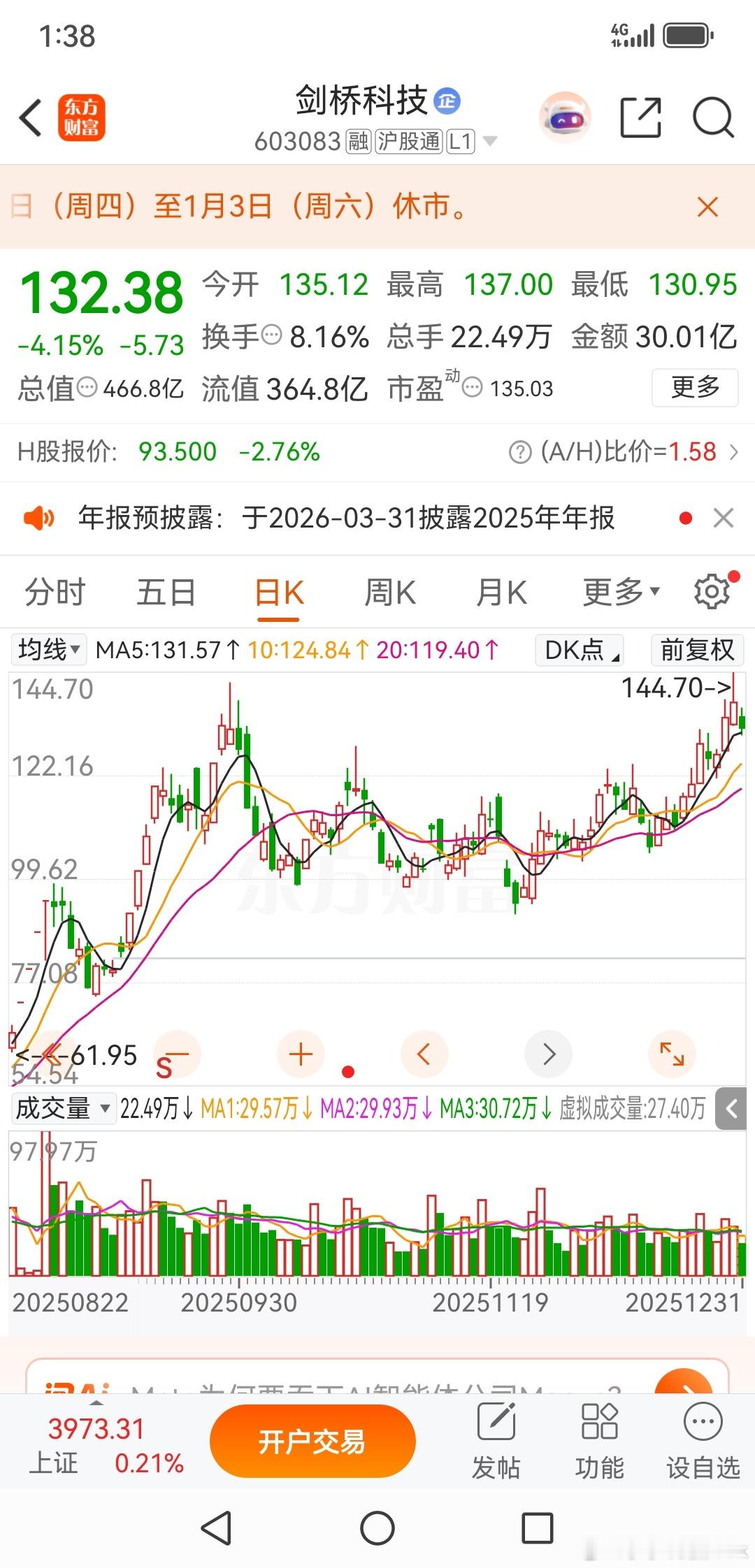 剑桥科技,小心一波调整即将到来剑桥科技,昨天我还在群里聊,不要迷信创新高,A股股票十次创新高,九次要下跌。剑桥科技,12月30日掀掉了9月29日的高点,创下了144.7元的历史新高,当日成交46.7亿换手12.14%。昨天的成交量没有明显的放大,今天为何要如此低调,难道是洗盘吗?创下历史新高,还洗什么盘啊!合理的解释,就是这个货很可能要挖坑了。我认为剑桥科技接下来大概率要挖坑,但挖坑的动作幅度可能不激烈,极有可能是以温吞水的方式进行。所以我认为有利润的朋友要及时兑现,回撤20-30%不是不可能的。欢迎加入我们的免费交流群财经股票