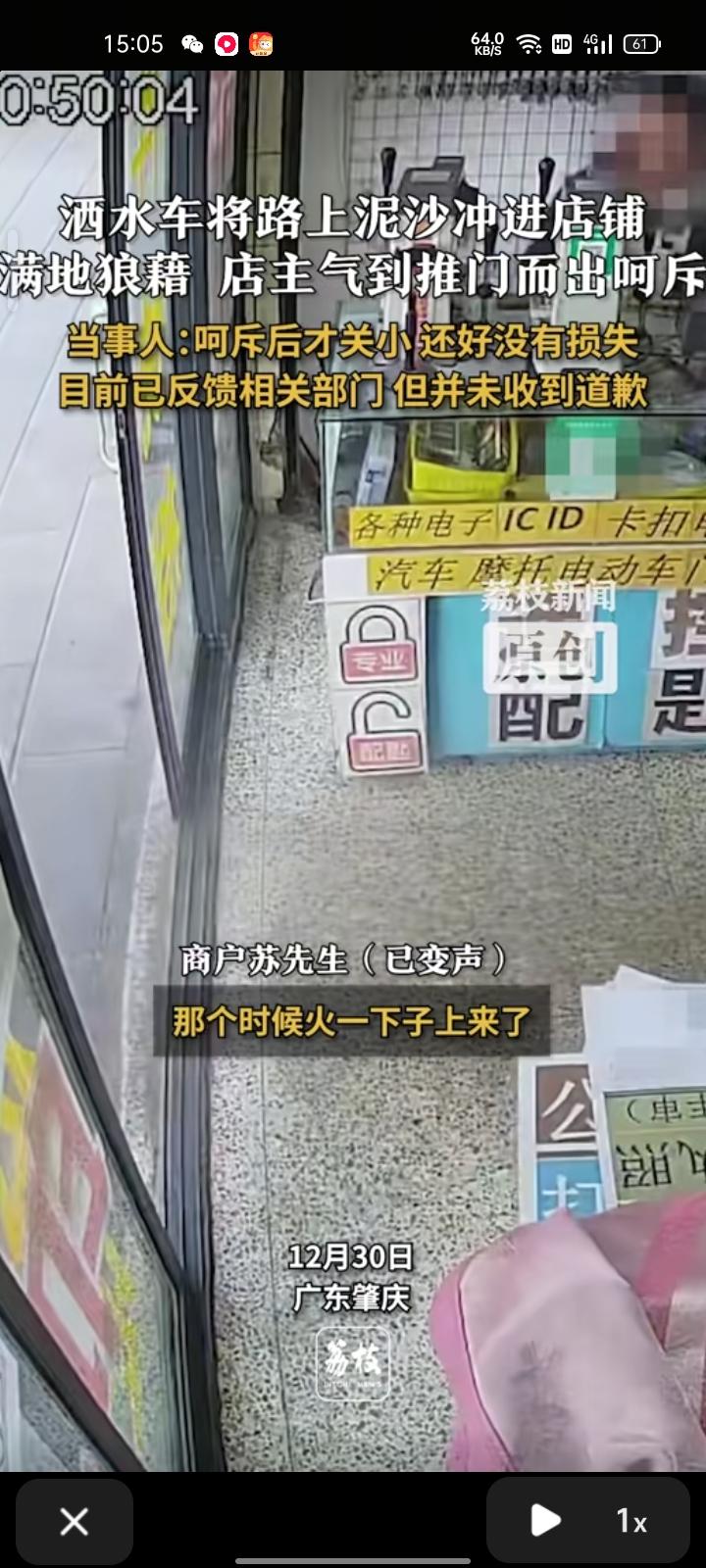 12月30日,广东肇庆。监控画面显示,一辆洒水车路过时泥沙冲进店里,满地狼藉,店主气到推门而出怒斥司机,司机听到后才关小,未造成任何损失。 店主苏先生表示,洒水车司机应该是工作的疏忽,店里没有损失,如果有肯定会找他赔偿,已反馈相关部门,到现在没有正面的道歉。