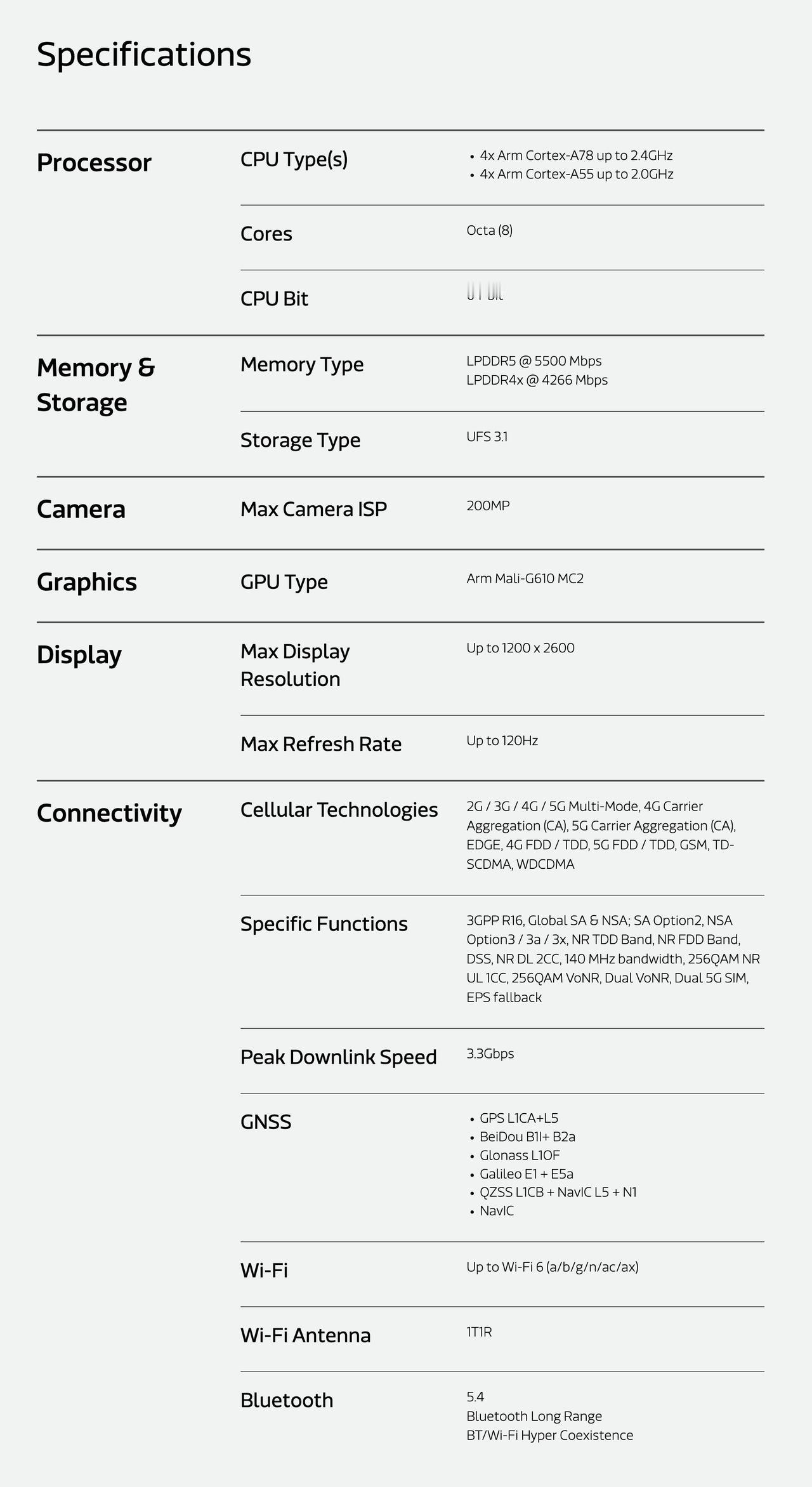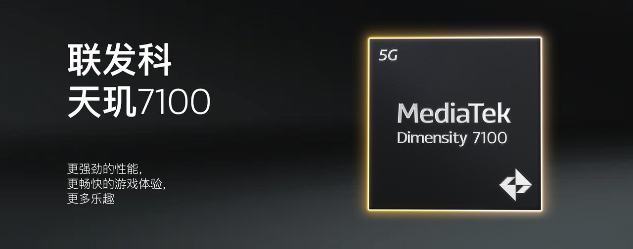 联发科发布天玑 7100 移动处理平台 - 制程:6nm,应用程序能效提升 5%、多媒体播放能效提升 16%; - CPU:4× 2.4GHz Cortex-A78 + 4× 2.0GHz Cortex-A55; - GPU:Mali-G610 MC2,游戏速度提升 8%; - 内存和闪存:最高 5500Mbps 内存 LPDDR5,UFS 3.1 闪存; - 连接性:5G 峰值下行速度 3.3Gbps(调制解调器节能 23%),支持 Wi-Fi 6,蓝牙5.4(超远距离蓝牙),双频 GPS,双频北斗; - ISP:支持 200MP,FD 性能提升 6 倍,10 倍自动对焦检测区域。