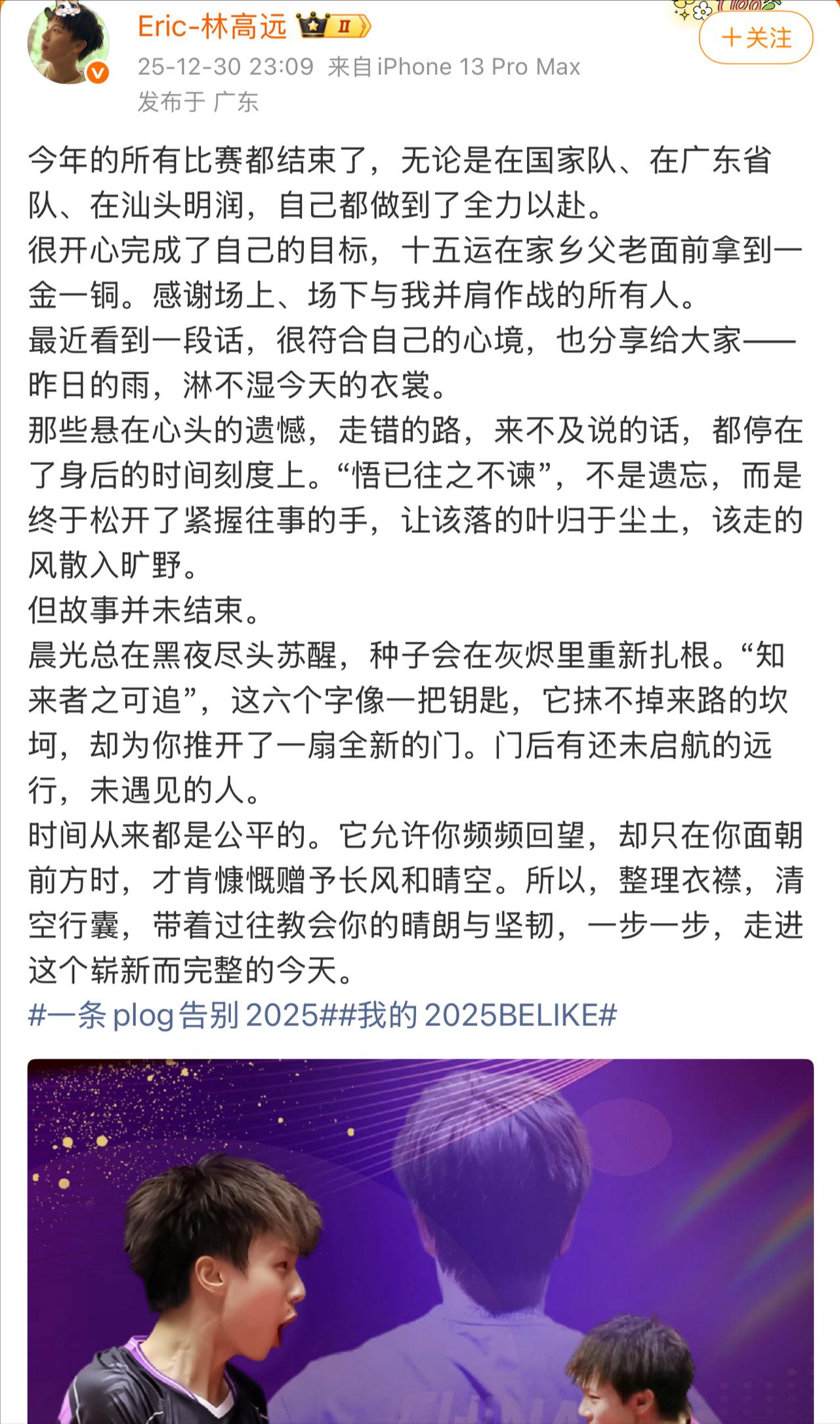 林高远发文总结:我却有个“不同建议”! 林高远,你改换赛道了! 30岁已过,竞争力下滑,与其坚持,还不如换个赛道。世界排名下降到50之外,很难有机会参加高级别赛事。 有人说老将坚守是情怀,但情怀不能当饭吃,林高远 2025 年不是不努力,是努力了跟不上,现在国乒年轻选手一拨接一拨冒头,技术更先进、体能更充沛,林高远在硬碰硬的竞争里,已经很难占到上风了。 那换赛道就一定是认输吗? 当然不是,转型当教练或者去推广乒乓球,把自己的经验传递给更多年轻人,难道不是另一种价值的体现?与其在赛场边缘苦苦挣扎,不如换个舞台发光发热。 几句良心忠告,可能有人不爱听,但却是肺腑之言!