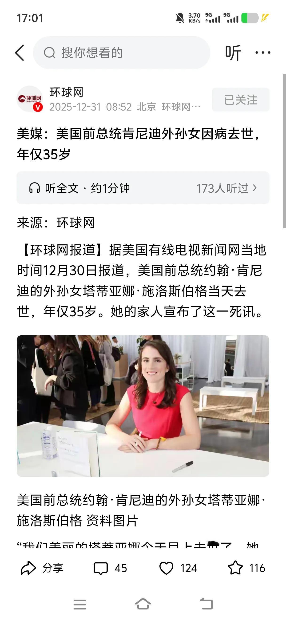 肯尼迪家族有短命的魔咒,他本人死于非命。肯尼迪35岁外孙女因病去世。在2024年被诊断为癌症,医生说她活不过一年。 有人说网上应该关注大事件。前总统女儿的女儿离世了,居然也报道一下。 人家也是名人贵族上层阶级。