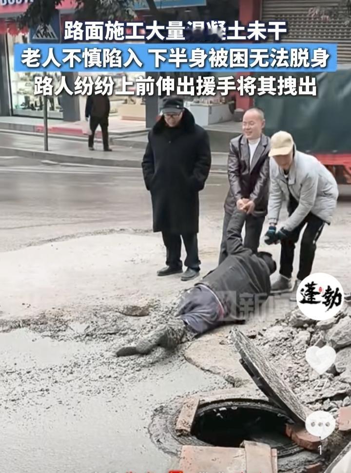 走路都不看?四川,路面施工大量混凝土未干,一老人路过一脚踩了进去,结果自己半截身子都陷了进去无法脱困,路人见到纷纷帮忙,最终把老人拽了出来。 老人走路都不看路的吗?那么明显倒的混泥土看不见,竟然还能直接陷进去,要是晚上视线模糊看不清还能理解,大白天的很明显就是不看路,好在有热心市民帮助,成功把老人拽了出来。 走路还是要看路,不然很容易磕着绊着,再者既然路面施工打混凝土,那么就应该围起来,以免有人误入陷进去。