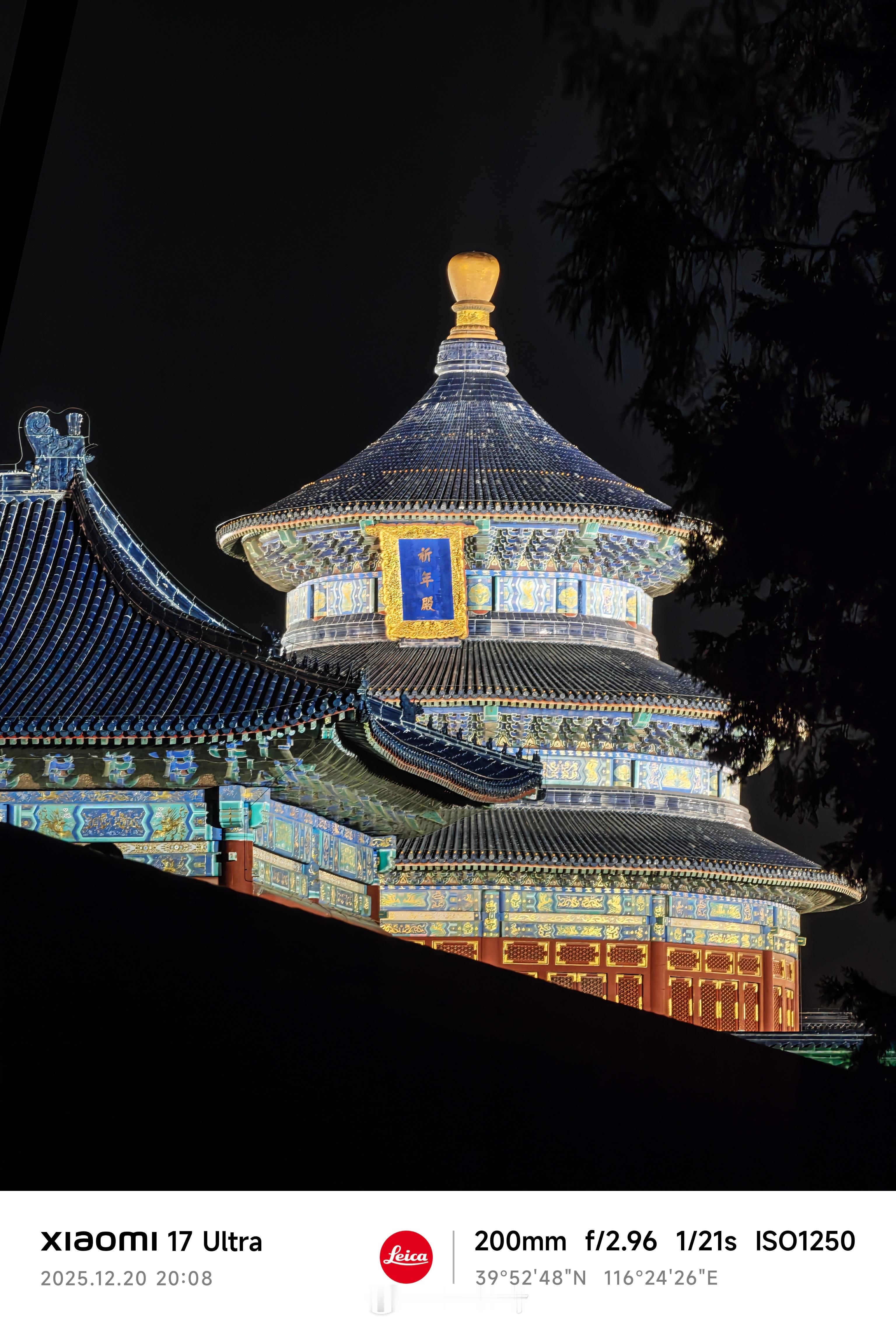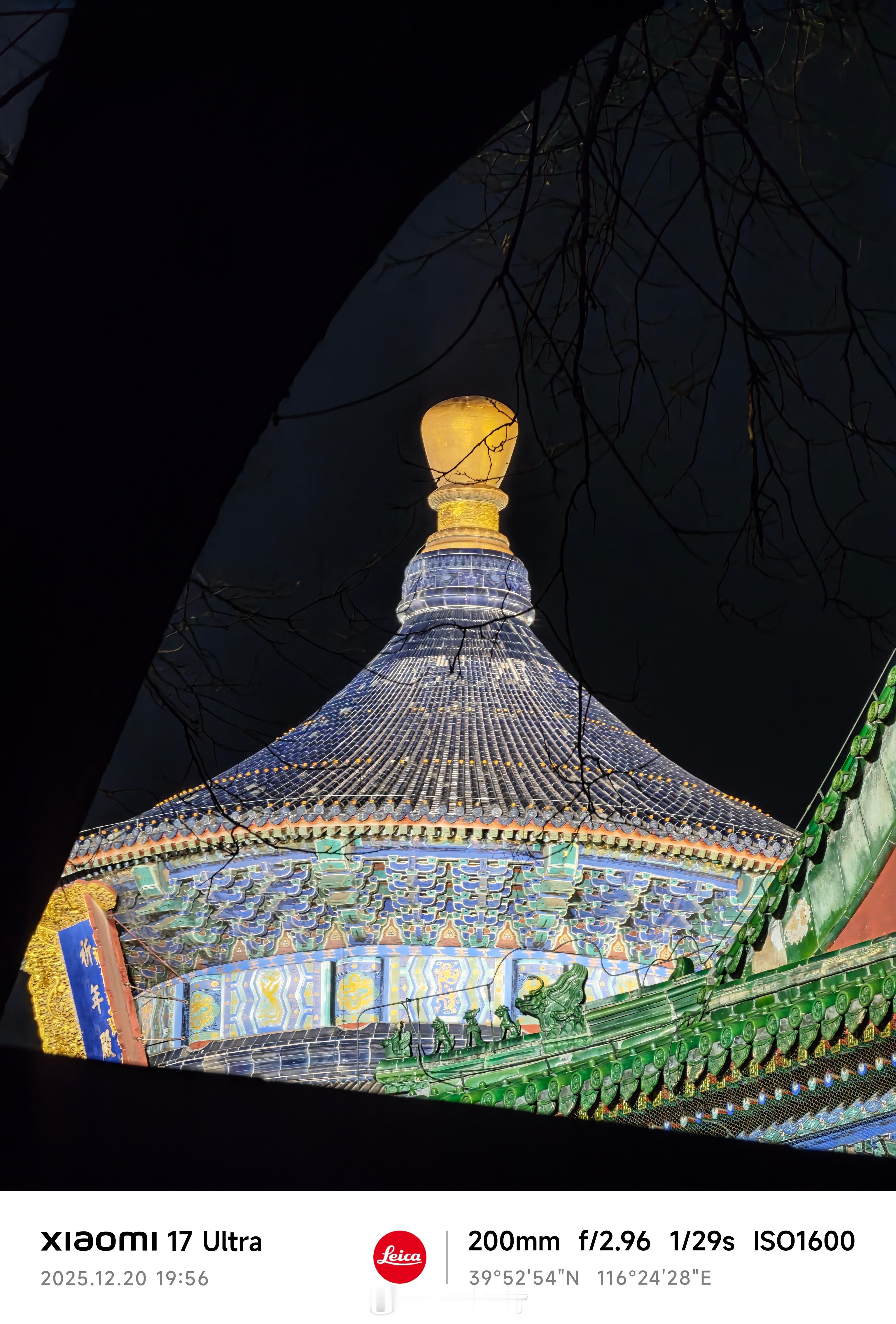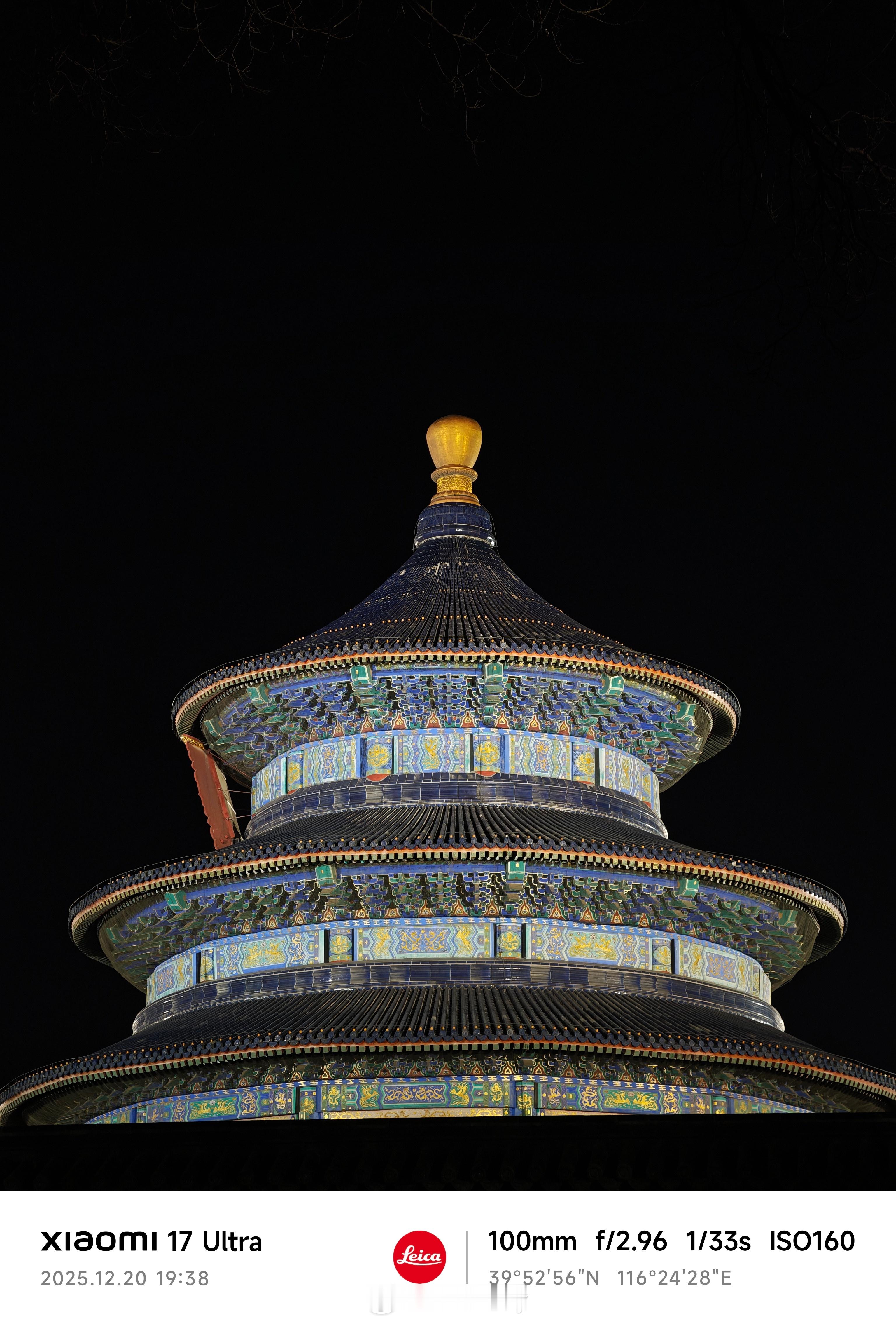 北京天坛,会在周五、周六以及特定节日亮灯。挺值得打卡的,夜景很美。前段时间拿着小米 17 Ultra 随手拍了几张祈年殿的照片,夜晚记录效果很棒。