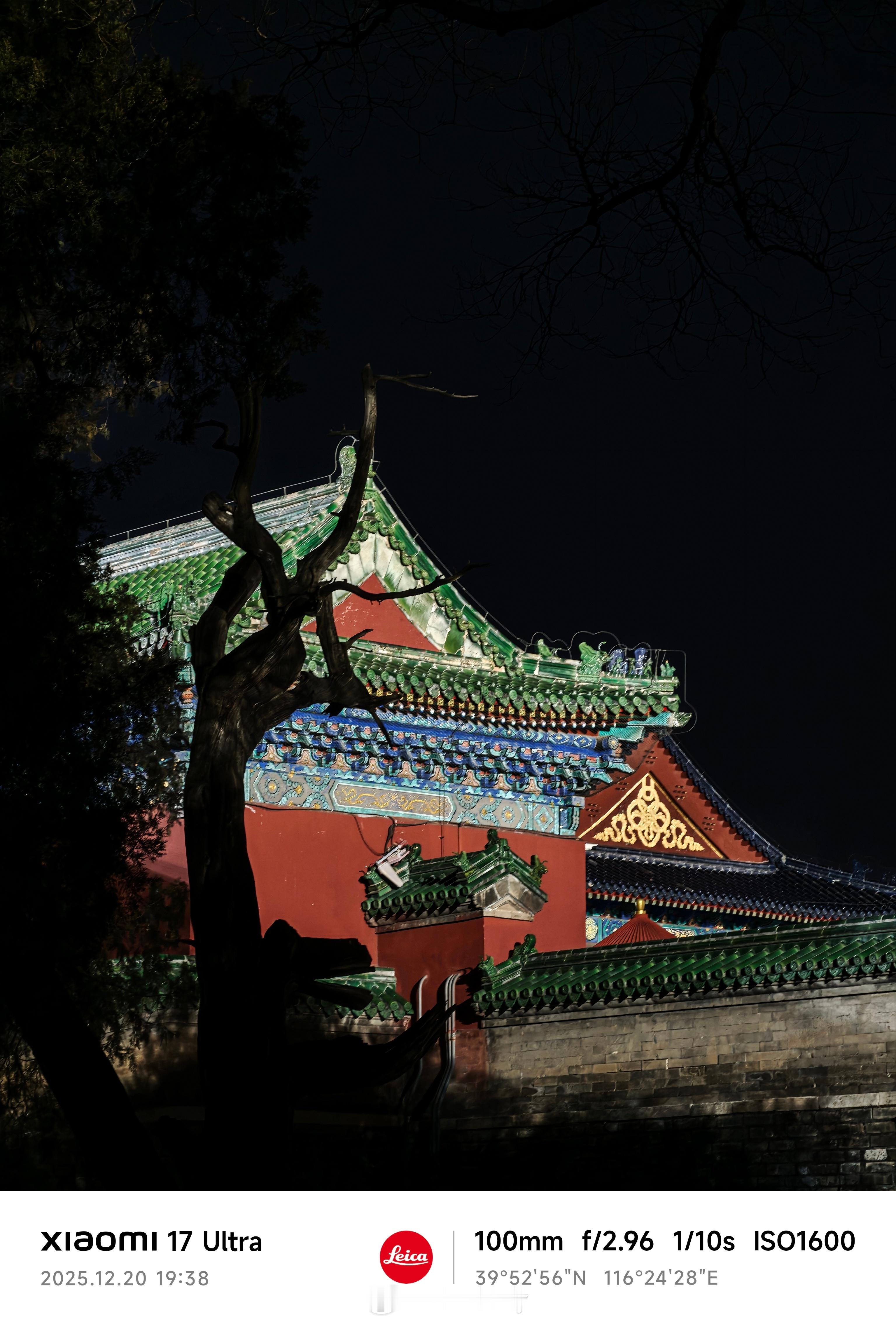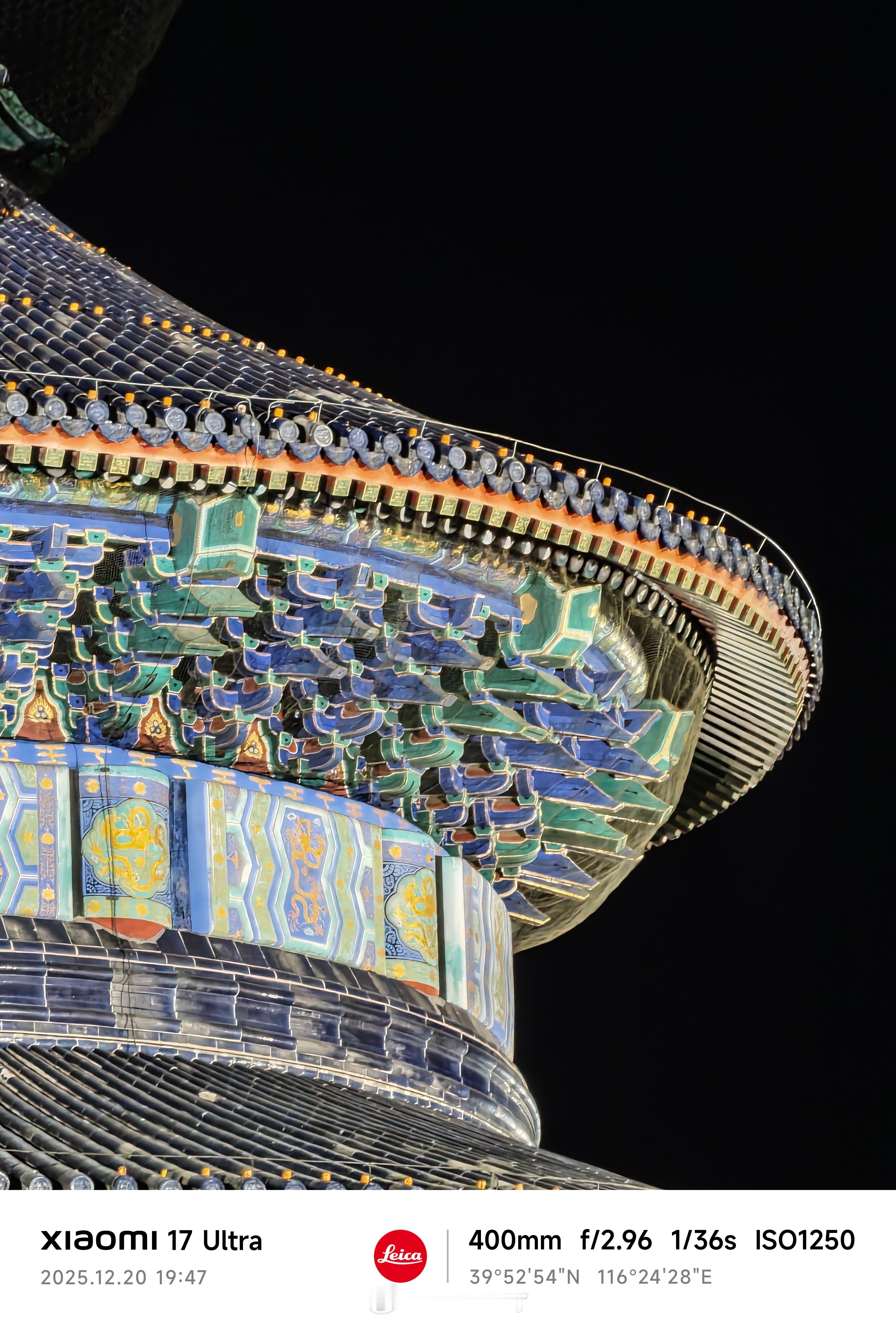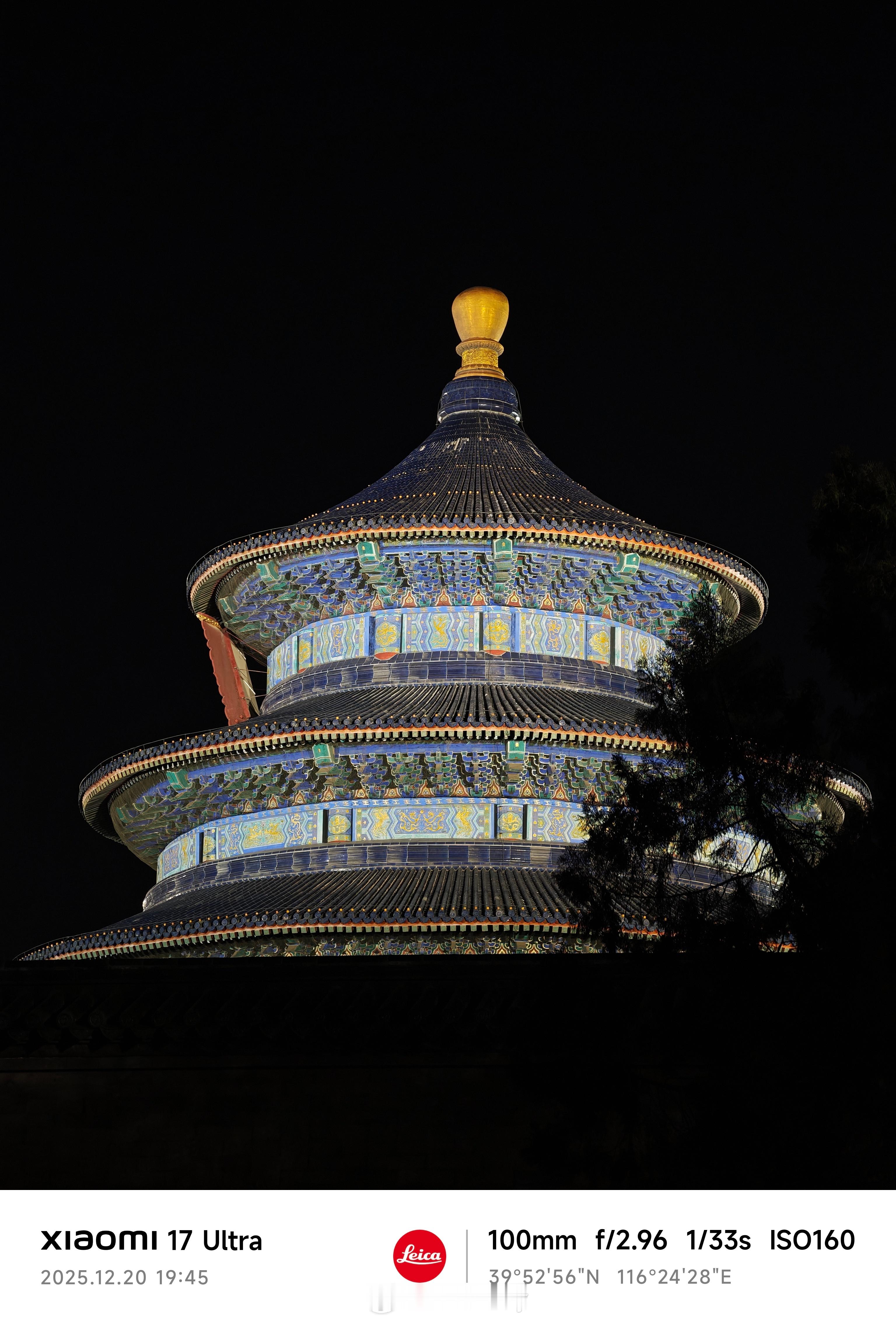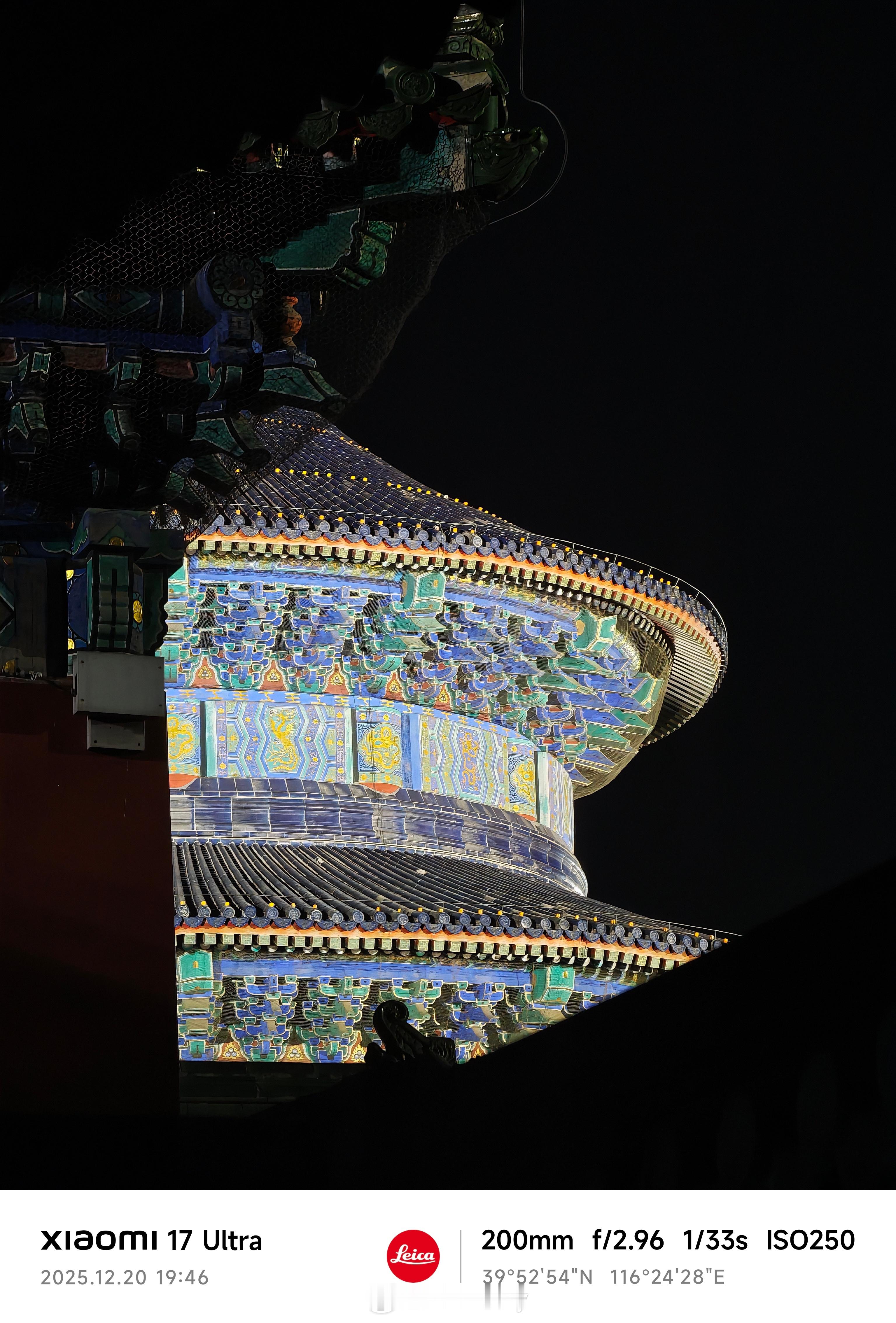 北京天坛,会在周五、周六以及特定节日亮灯。挺值得打卡的,夜景很美。前段时间拿着小米 17 Ultra 随手拍了几张祈年殿的照片,夜晚记录效果很棒。
