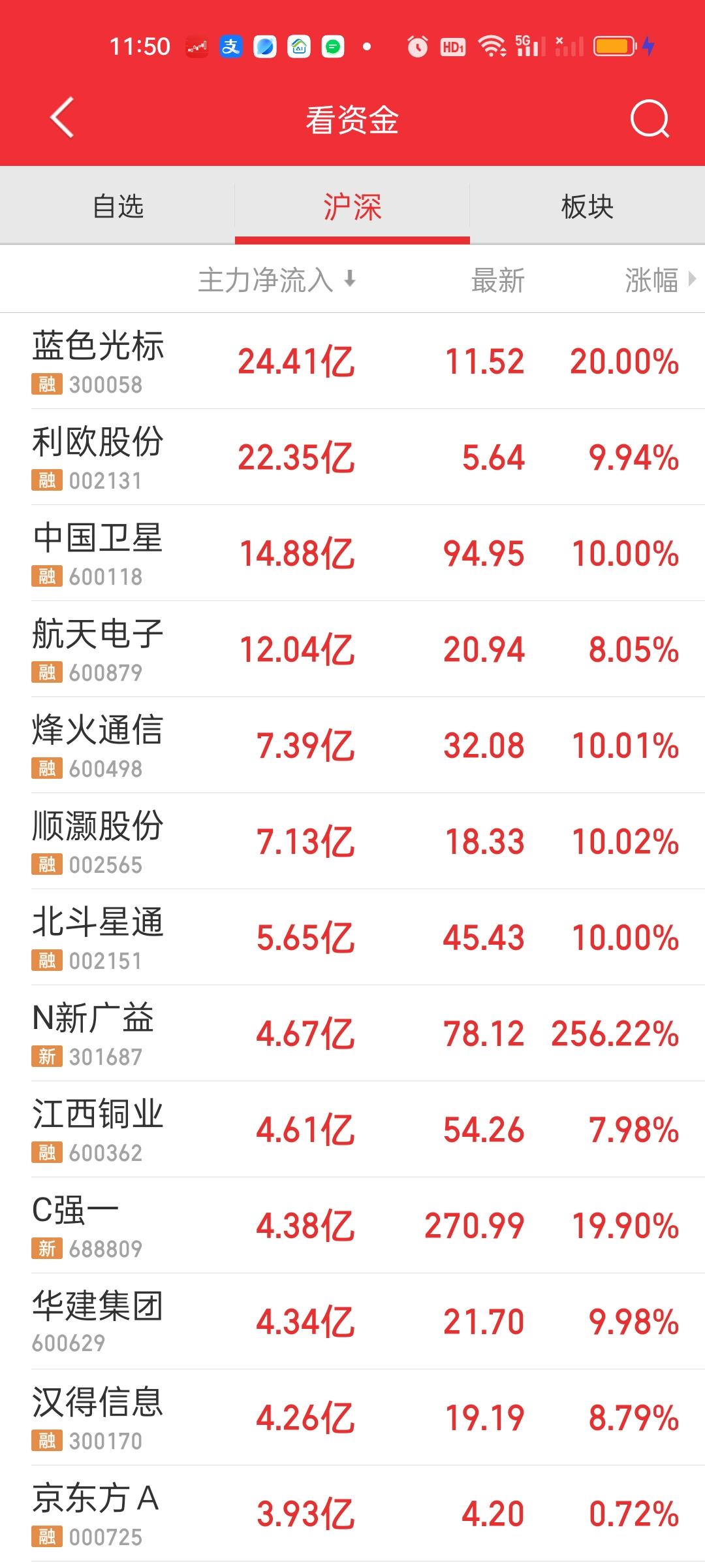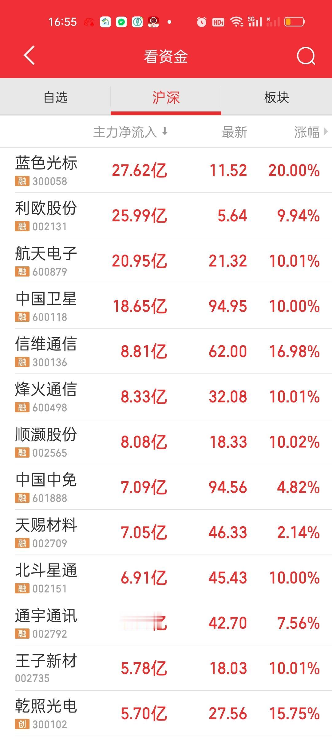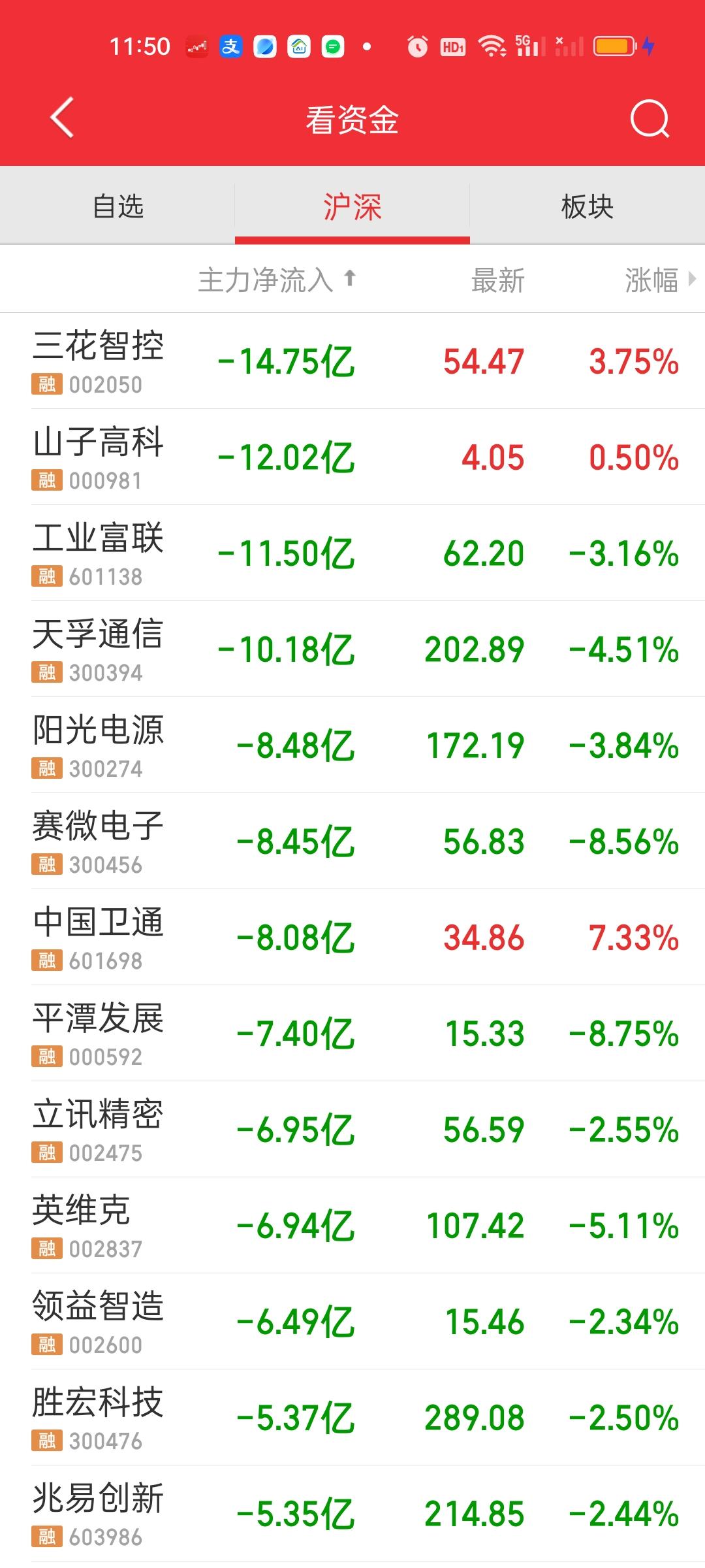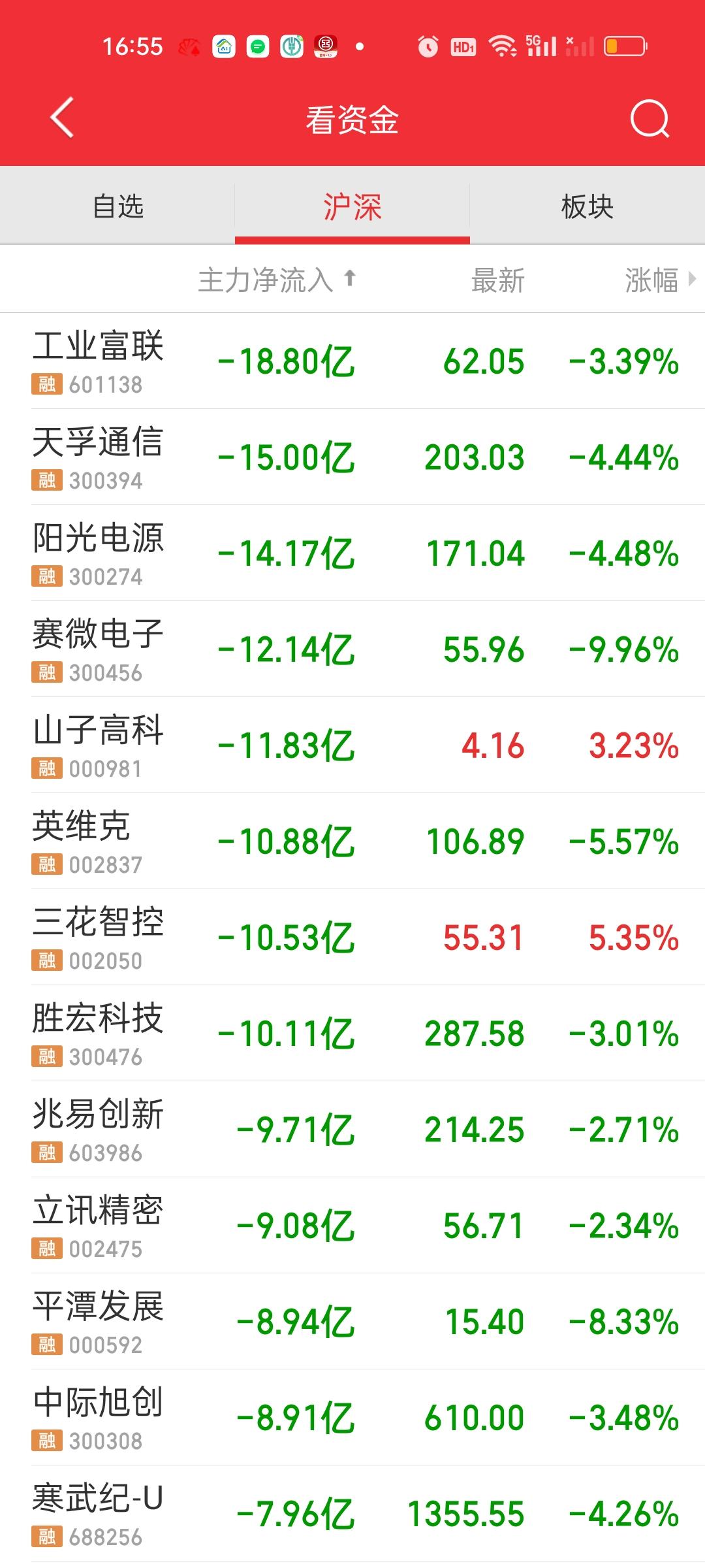 收盘了,全天成交量在2万亿以上,严格来说这个量并不算低。但相比昨天依旧缩量了956亿元,而且上午收盘是放量210亿的,这就说明下午实际缩量了956+210=1166亿。大盘资金净流出546.32亿,这说明下午净流出了546.32-390.65=155.67亿。 上涨家数也比上午多出来近300家。但赚钱效应没有想象的那么强,主力资金净流入方面,流入资金超10亿的还是上午的4只,蓝色光标,利欧股份,航天电子和中国卫星。 资金流出方面,流出超过10亿的除了上午的4家,下午又新增了4家。阳光电源,赛微电子,英维克,胜宏科技,兆易创新和立讯精密净流出资金也在9亿以上。