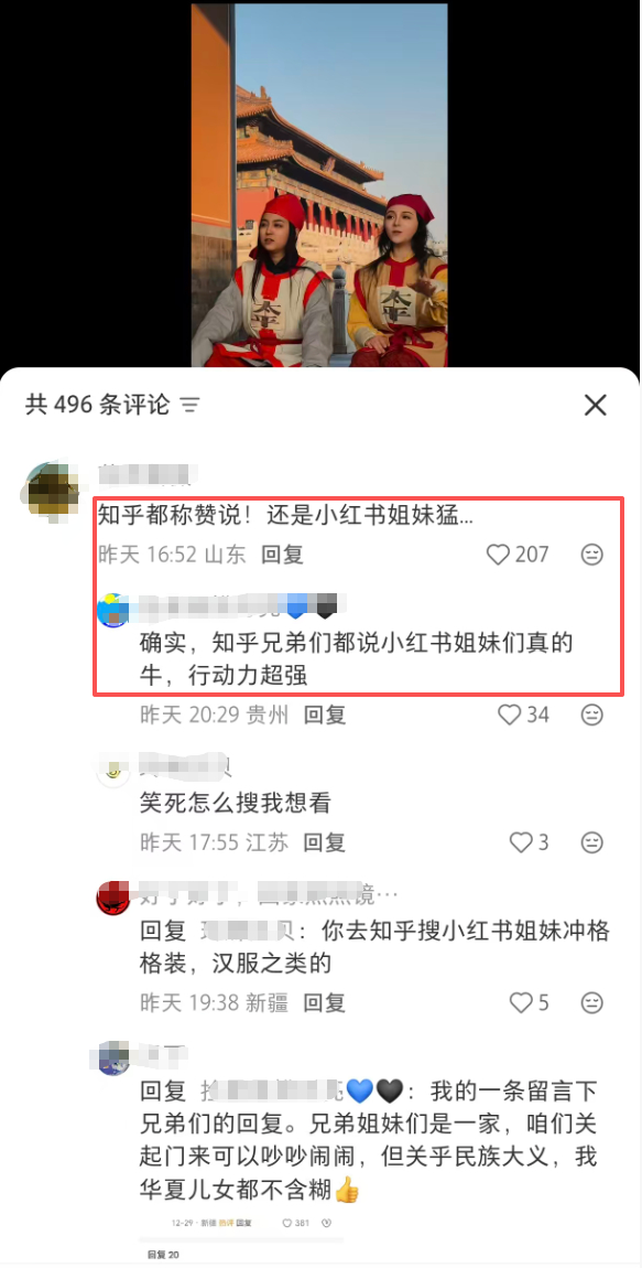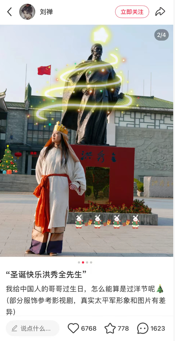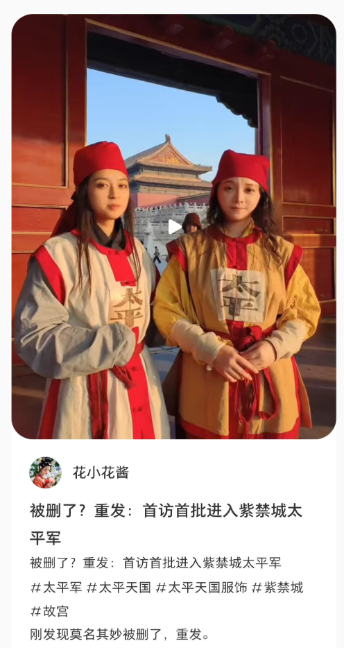 最近出现了一个很有趣的史诗级互联网和解。起因是几位小红书的女博主穿太平天国服饰去故宫打卡,把几家原本互相看不惯的平台用户,都团结起来了。知乎那边一边倒的夸赞:“还是小红书的集美厉害”,红书那边也反应过来原来大家还是能团结的,“知乎兄弟都说红书姐妹牛”,事实证明,在人民群众的历史观面前,在某些大是大非的原则立场面前,什么家长里短的性别争端都要让位。而且红书姐妹还是充满智慧的阳谋,因为太平军不是禁忌,我们中学教材里直接正面定性“历史上规模最宏大的一次农民战争,沉重地打击了清朝封建统治”,人民史观一直对其是正面评价。甚至这集合了「穿衣自由」,「教科书的正确叙事立场」,「打破性别对立的团结」,「基于华夏自信的女性力量」等许多绝对正确又安全的叙事,不仅能直接表达观点,又让那群在历史叙事上夹带私货的破防者找不到任何反驳空间。小红书汉服互联网