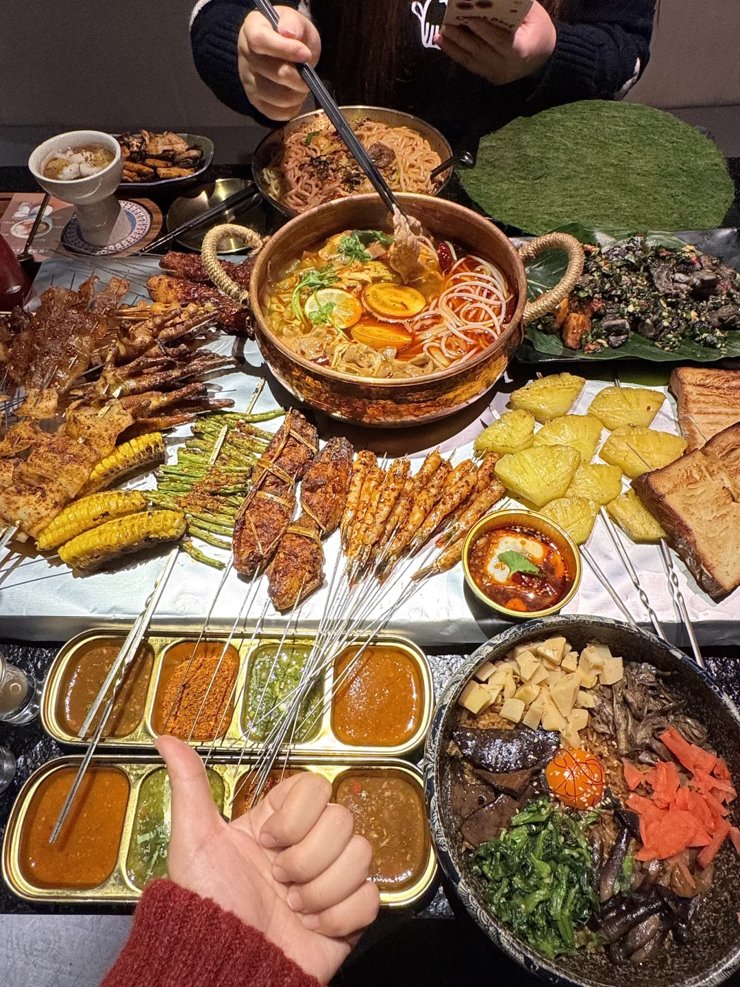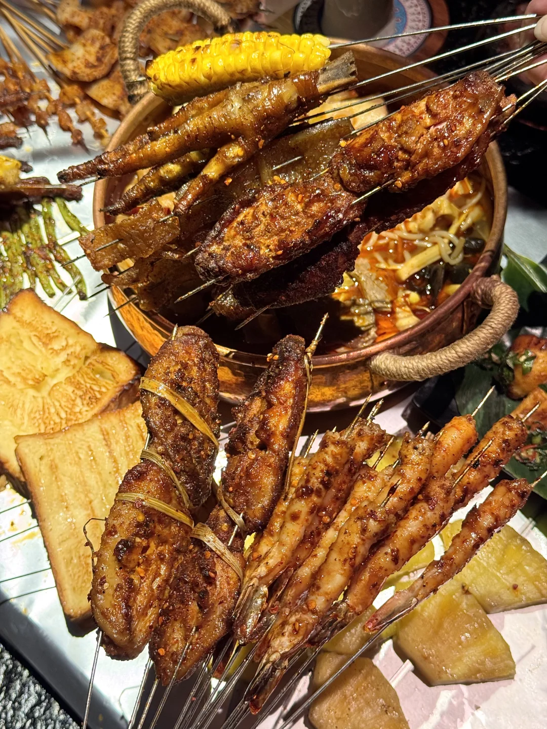 就在静安寺附近!!和朋友连吃三天😭真的好吃! 烧烤很新鲜每日现穿!我推荐:香茅草鸡翅!卤烤鸡爪!烤大虾!烤猪皮…裹满辣椒面蘸点傣味湿酱爱惨了! 菜品可以盲点,边境酸笋牛肉肥肠锅、百香果酸辣米线、云腿笋牛肝菌焖饭…生意这么好果然是有原因的。。。🙏叫:潘小烧) 上海美食 上海旅游 上海小吃
